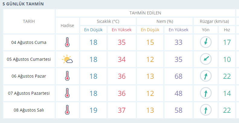 Meteoroloji Genel Müdürlüğü Hava Tahmin Uzmanı Abdullah Macit, Afrika’dan gelen sıcak hava dalgasının Türkiye’yi etkileyeceğini ve sıcaklıkların haftasonu iç bölgelerde mevsim normallerinin 4 ila 8 derece üzerinde seyredeceğini açıkladı.Macit, şunları söyledi: "Afrika’dan gelen sıcak hava dalgası ile sıcaklıklar iç bölgelerde 4 ila 8 derece, Ege ve Akdeniz kıyıları ile Güneydoğu Anadolu’da mevsim normallerinin 2-4 derece üzerinde seyredecek. Akdeniz bölgesinin kıyı kesiminde yüksek nemle birlikte hissedilen sıcaklıkların daha da fazla olacağını tahmin ediyoruz."