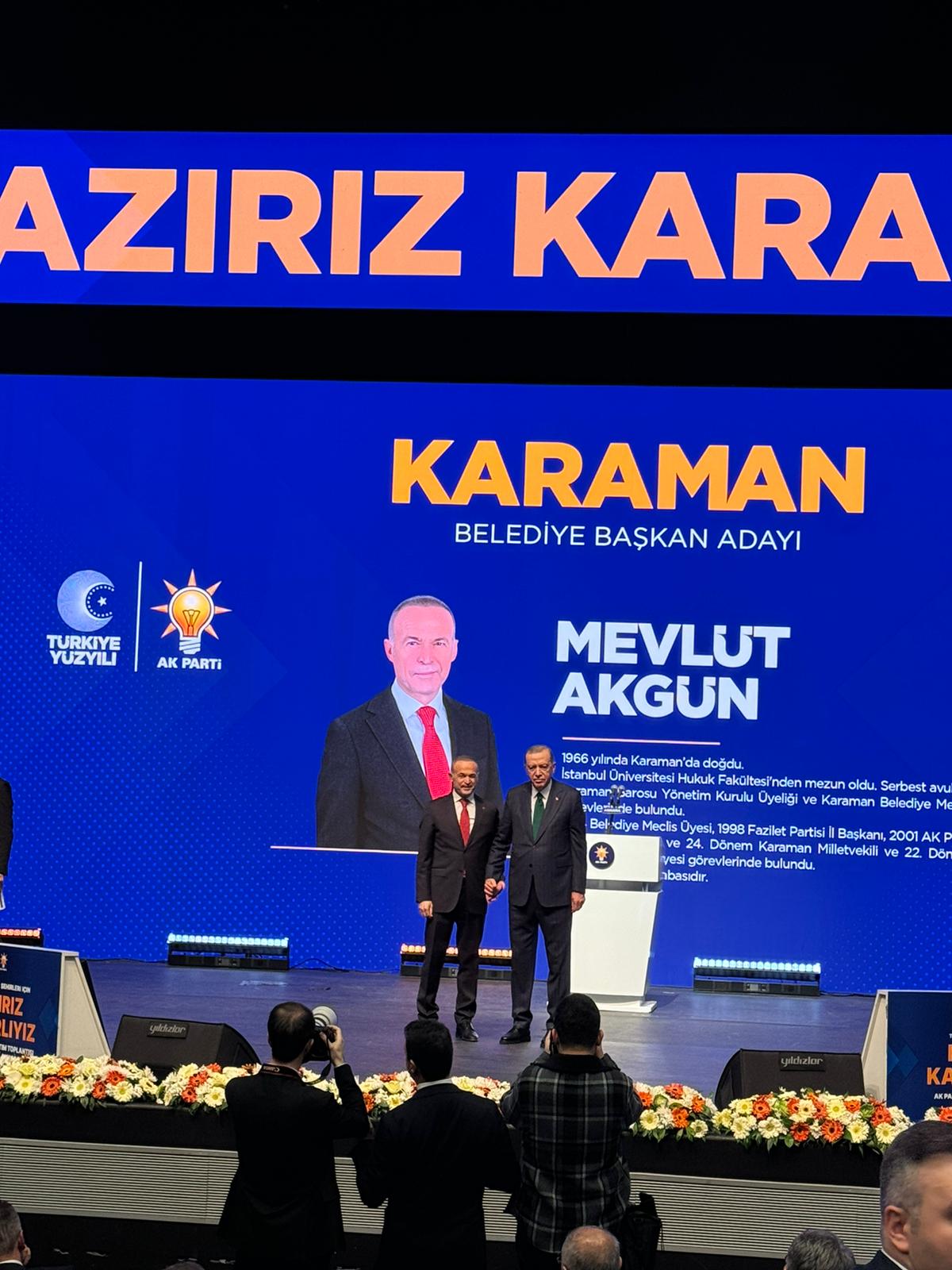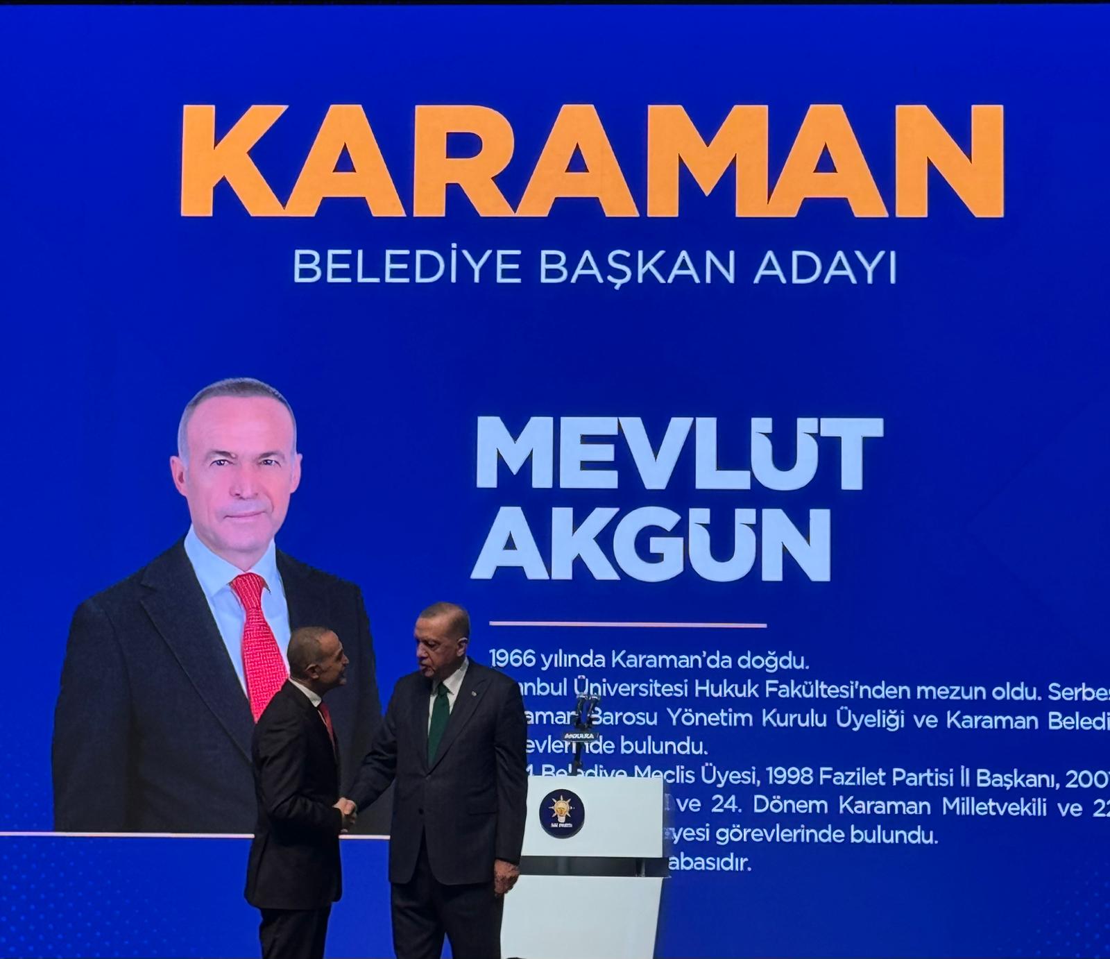 31 Mart 2024'de gerçekleşecek yerel seçimlere kısa bir süre kala merak edilen en önemli bölgelerin başında gelen Karaman'ın AK Parti Belediye Başkan adayı kim olacak? Sorusu da cevabını bulmuş oldu. 2024 yerel seçimleri için geri sayım başladı. Partiler Karaman belediye başkan adayları ile ilgili çalışmalarını sürdürüyor. 2024 yılının Mart ayında yapılacak yerel seçimlerin öncesinde, AK Parti Karaman Belediye Başkan Adayı da açıklandı.AK Parti'nin ATO Kongre Merkezi’nde gerçekleştirdiği ikinci aday tanıtım toplantısında eski milletvekili Mevlüt Akgün, Cumhurbaşkanı Recep Tayyip Erdoğan tarafından AK Parti Karaman Belediye Başkan Adayı olarak açıklandı.Toplantıya; AK Parti Karaman Milletvekilleri Selman Oğuzhan Eser ve Osman Sağlam, İl Başkanı Av. Murat Öztürk, Kadın Kolları Başkanı Fatma Coştu, Gençlik Kolları Başkanı Ahmet Yavuz katıldı. AK Parti, 7 Ocak’ta İstanbul’da düzenlenen ilk programda 26 ilin belediye başkan adaylarını tanıtmıştı. Ankara’daki ikinci aday tanıtım toplantısında Karaman dahil 48 ilin adayını açıkladı.