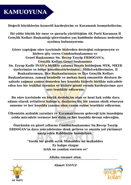 AK Parti Karaman Gençlik Kolları Başkanı Ahmet Yavuz yaşı nedeni ile Gençlik Kolları Başkanlığından ayrılığını duyurdu.Eski Başkan Ahmet Yavuz'un yerine Av. Muhammet Yusuf Kara atandı.Ayrılık haberini sosyal medya üzerinden duyuran Yavuz şunları söyledi;"Değerli büyüklerim kıymetli kardeşlerim ve Karamanlı hemşehrilerim;İki yıldır büyük bir onur ve gururla yürüttüğüm AK Parti Karaman İl Gençlik Kolları Başkanlığı görevimden yaş haddimin dolması nedeniyle hafta sonu yapacağımız Gençlik Kolları Başkanlığı İl kongremiz ile ayrılıyorum.Görev yaptığım süre içerisinde bizlerden desteğini esirgemeyen ve bizlere güç veren Cumhurbaşkanımız, Genel Başkanımız Sn. Recep Tayyip ERDOĞAN'a, Gençlik Kolları Genel başkanımız Sayın Eyyup Kadir İNAN'a birlikte çalışma fırsatı bulduğum MYK, MKYK üyelerimize ve bölge koordinatörlerimize, Milletvekillerimize, İl Başkanlarımıza, İlçe Başkanlarımıza ve İlçe Gençlik Kolları Başkanlarımıza, zaman bendedir ve mekan bana emanettir düsturu ilesahada yağmur çamur demeden her koşulda bizlerle birlikte mücadele eden her bir teşkilat üyemize ve bizlere gönül vermiş kardeşlerime ayrı ayrı teşekkür ediyorum.Bu süre içerisinde en büyük destekçim olan ve beni hak yolda dava adamı olarak yetiştiren babam'a, dualarını hiç bir zaman eksik etmeyen anneme ve her koşulda yanıma olan canım eşime teşekkür ediyorum.Ülkemizin aydınlık yarınları ve Karaman'ımızın geleceği için inandığım yolda mücadele vermeye her daim ve her koşulda devam edeceğim.Ömrümün en güzel yıllarını Cumhurbaşkanımız Sn.Recep Tayyip ERDOĞAN’ın dava mücadelesine denk getiren ve onunla yol yürümeyi nasip eden Rabbimize hamdolsun."Surda bir gedik açtık Mukaddes mi mukaddesEy kahpe rüzgarArtık ne yandan esersen es"Görevi devralan Muhammet Yusuf KARA kardeşime başarılar dilerim.Allaha emanet olun."