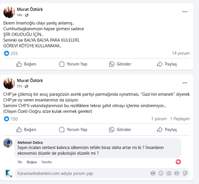 "yolsuzluk" soruşturması kapsamında tutuklanması hem muhalefetin hemde iktidarın gündemi oldu.Karaman'da muhalefet kanadı ve CHP üyesi olmayan vatandaşlar dün Ekrem İmamoğlu için sandık başına gitti. İktidar kanadından ise çokça eleştiri alan İmmaoğluna bir eleştiri de Karaman İl Başkanı Murat Öztürk'ten geldi.Öztürk sosyal medya paylaşımında