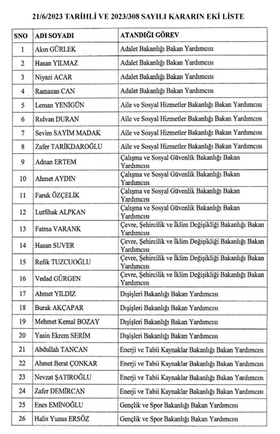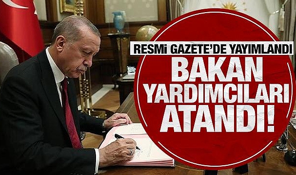 Cumhurbaşkanı Recep Tayyip Erdoğan'ın bakan yardımcılıklarına atama kararları Resmi Gazete'de yayımlandı.Buna göre, Adalet Bakanlığı bakan yardımcılıklarına Akın Gürlek, Hasan Yılmaz, Niyazi Acar ve Ramazan Can, Aile ve Sosyal Hizmetler Bakanlığı bakan yardımcılıklarına Leman Yenigün, Rıdvan Duran, Sevim Sayim Madak ve Zafer Tarikdaroğlu, Çalışma ve Sosyal Güvenlik Bakanlığı bakan yardımcılıklarına Adnan Ertem, Ahmet Aydın, Faruk Özçelik ve Lutfihak Alpkan atandı.Çevre, Şehircilik ve İklim Değişikliği Bakanlığı bakan yardımcılıklarına Fatma Varank, Hasan Suver, Refik Tuzcuoğlu ve Vedad Gürgen atanırken, İçişleri Bakanlığı bakan yardımcılıklarına Bülent Turan, Mehmet Aktaş, Mehmet Sağlam ve Münir Karaloğlu, Kültür ve Turizm Bakanlığı bakan yardımcılıklarına ise Batuhan Mumcu, Gökhan Yazgı, Nadir Alparslan ve Serdar Çam getirildi.Milli Eğitim Bakanlığı bakan yardımcılıklarına Celile Eren Ökten, Kemal Şamlıoğlu, Nazif Yılmaz ve Ömer Faruk Yelkenci, Milli Savunma Bakanlığı bakan yardımcılıklarına Alparslan Kavaklıoğlu, Bilal Durdalı, Celal Sami Tüfekçi ve Şuay Alpay, Sağlık Bakanlığı bakan yardımcılıklarına Huzeyfe Yılmaz, Hüseyin Kürşat Kırbıyık, Şuayıp Birinci ve Tolga Tolunay atandı.Söz konusu atamalar, 3 sayılı Cumhurbaşkanlığı Kararnamesi'nin 2, 3 ve 4'üncü maddeleri gereğince yapıldı.