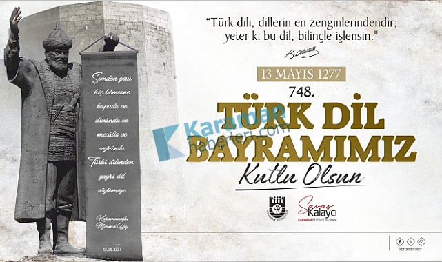Belediye Başkanı Savaş Kalaycı, mesajında: “Türkçemizin Anadolu’da ilk kez devlet dili olarak kabul edilişinin 748. yılını büyük bir gurur ve coşkuyla kutlarken, sevgi ve hoşgörünün timsali, gönül ereni Yunus Emre’yi de rahmet ve minnetle anıyoruz. Karamanoğlu Mehmet Bey’in, 13 Mayıs 1277 tarihinde yayımladığı fermanla Türkçemiz; resmi devlet dili olarak ilan edilmiştir. Bu tarihi karar, milletimizin kendi öz kimliğine bağlılığının bir simgesi olmuştur. Yine Yunus Emre’nin insanlık değerlerini yücelten eserleri de; dilimizi daha da zenginleştirmiş, gönüllerimize bir nakış gibi işlemiştir. Türk Dili, yüzyıllar boyunca pek çok kültürle etkileşim içinde gelişmiş, kendine özgü yapısı ve zengin kelime dağarcığı ile dünya dilleri arasında özel bir yer edinmiştir. Dil, kültürel mirasın en önemli taşıyıcılarından biridir. Bu kıymetli mirasa sahip çıkmak hepimizin ortak sorumluluğudur. Bu yıl 9-13 Mayıs tarihleri arasında kutlanılan etkinliklerle, Türkçemizin gücünü ve güzelliğini bir kez daha ortaya koyacağız. Türk dilinin bugüne gelmesini sağlayan Karamanoğlu Mehmet Bey ve hak aşığı Yunus Emre başta olmak üzere Türkçemizin gelişmesine ve doğru kullanımına katkı sunan tüm ecdadımızı rahmet, minnet ve şükranla yâd ediyor, dilimizin; devletimiz ve milletimizle birlikte ilelebet baki kalmasını temenni ederek tüm hemşehrilerimi sevgi, saygı ve muhabbetle selamlıyorum. 748. Türk Dil Bayramımız kutlu olsun.” dedi.