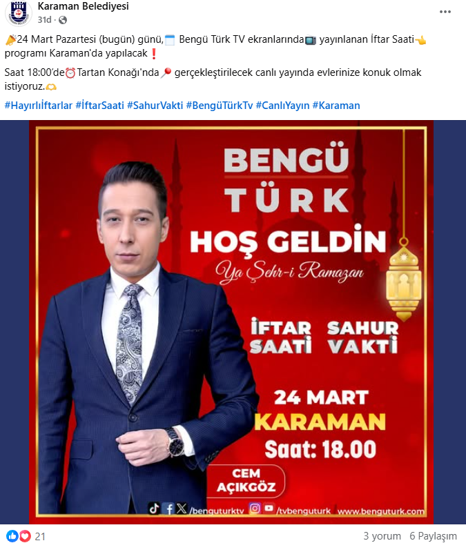 Karaman Belediyesi sosyal medya hesabından Başkan Kalaycı'nın Bengü Türk Televizyonunda canlı yayında olacağını açıklamıştı. Karaman Belediyesi sosyal medya hesabından paylaşımı silerek yayına sadece Cem Açıkgöz'ün katılacağı pankartı yayınladı.Bugün iftar saatinde Tartan Konağında gerçekleştirilecek organizasyon, Tüm Karaman halkının evlerine konuk olacak.Karaman Belediyesinin sosyal medya hesabından yapılan paylaşımda şu ifadeler kullanıldı;"24 Mart Pazartesi (bugün) günü, Bengü Türk TV ekranlarında yayınlanan İftar Saati programı Karaman'da yapılacak.Saat 18:00’de Tartan Konağı'nda gerçekleştirilecek canlı yayında evlerinize konuk olmak istiyoruz."