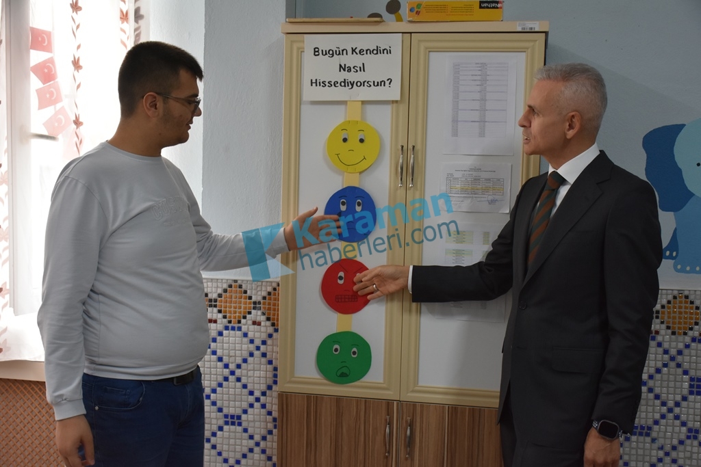 Ziyaret programı, Okul Müdürü Yaşar Göktepe’nin okulun eğitim anlayışı ve geliştirdiği projelere ilişkin bilgilendirmesiyle başladı. Ardından sınıfları gezerek öğrencilerle bir araya gelen Valimiz Mehmet Fatih Çiçekli, özel eğitim öğrencileriyle sohbet ederek yürütülen çalışmalar hakkında öğretmenlerden bilgi aldı.