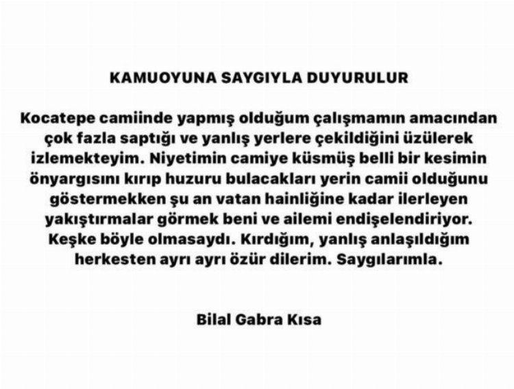 Sosyal Medya hesabından özür dileyerek şu ifadeleri paylaştı;Kocatepe camiinde yapmış olduğum çalışmamın amacından çok fazla saptığı ve yanlış yerlere çekildiğini üzülerek izlemekteyim. Niyetim camiye küsmüş belli bir kesimin önyargısını kırıp huzuru bulacakları yerin cami olduğunu göstermekken şu an vatan hainliğine kadar ilerleyen yakıştırmalar görmek beni ve ailemi endişelendiriyor. Keşke böyle olmasaydı. Kırdığım, yanlış anlaşıldığım herkesten ayrı ayrı özür dilerim. Saygılarımla...