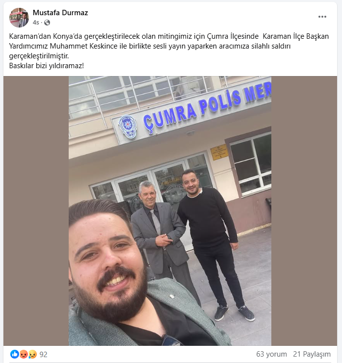 1 Mayıs münasebeti ile Cumhuriyet Halk Partisi’nin katılacağı mitinge silahlı saldırı düzenlendi.Olay dün Konya’nın Çumra ilçesinde gerçekleşti. Edinilen bilgilere göre Cumhuriyet Halk Partisi Karaman Teşkilatı’nın olduğu araca silahlı saldırı oldu.CHP heyetini taşıyan anons aracına caddeden geçtiği esnada kimliği belirlenemeyen bir şahıs tarafından silahlı saldırıya uğradı.CHP Karaman İl Başkan Yardımcısı Mustafa Durmaz şunları söyledi;“Konya’da gerçekleştireceğimiz miting için Çumra ilçesinde saha çalışması yürütürken, partimize ait araçla sesli yayın yapıyorduk. Bu sırada aracımıza silahlı saldırı gerçekleştirildi. Bu menfur saldırıyı en sert şekilde kınıyoruz. Yol arkadaşım Muhammet Keskince’ye geçmiş olsun dileklerimi iletiyorum. Hiçbir baskı, hiçbir tehdit bizi yolumuzdan döndüremez. Ne yaparlarsa yapsınlar, biz halkın sesi olmaya ve mücadelemize devam edeceğiz.”