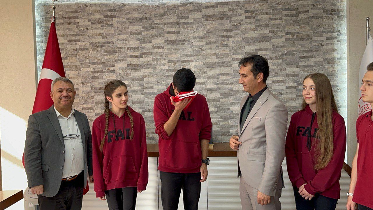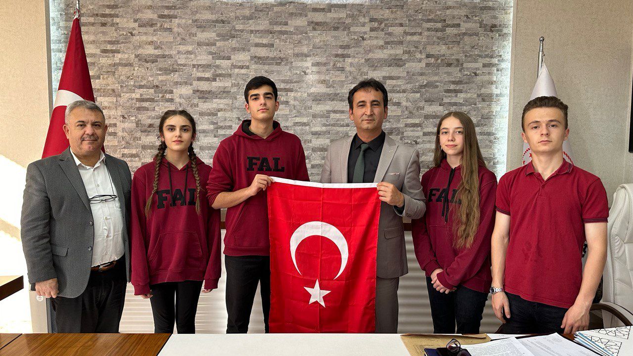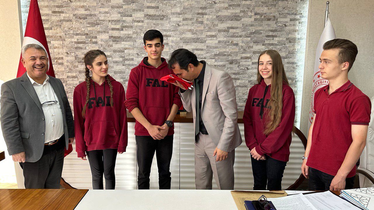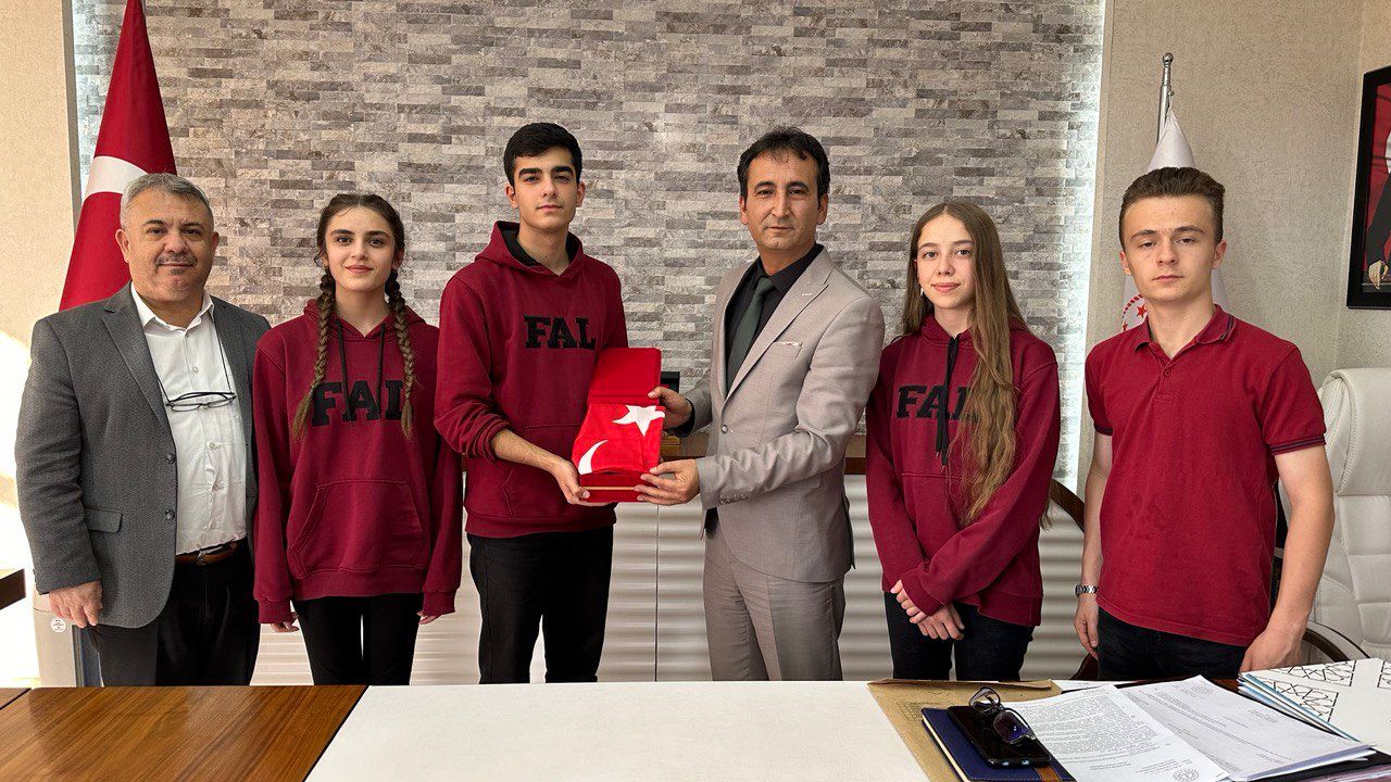 Cumhuriyetin 100. yılı sebebiyle “100 Öğrenci, 100 Bayrak ve 100 Kapı” etkinliği düzenleyen Fatih Anadolu Lisesi öğrencileri, İl Millî Eğitim Müdürü Mehmet Çalışkan’ı ziyaret ederek ilk bayrağı İl Müdürü Çalışkan’a takdim etti.