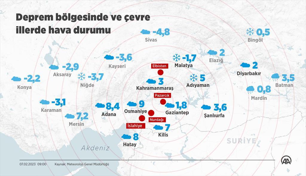 Merkezi Kahramanmaraş'ın olan 7.7 ve 7.6'lık yıkıcı deprem lertüm Güneydoğu Anadolu'da hissedildi. Birçok kentte yıkıcı hasara neden olan sarsıntılar nedeniyle 4. seviye alarm durumuna geçilirken depremin hasar verdiği bölgelerden acı haberler gelmeye devam ediyor.Peki deprem bölgelerinde hava nasıl? Kar, yağmur var mı? İşte Kahramanmaraş, Hatay, Gaziantep, Osmaniye, Malatya, Adıyaman, Adana, Diyarbakır, Kilis ve Şanlıurfa hava durumu... Meteoroloji Genel Müdürlüğünün hava tahmin raporlarına göre, 7.7 ve 7.6 büyüklüğündeki depremlerden en çok etkilenen Diyarbakır, Malatya ve Adıyaman'da kar yağışlı, Şanlıurfa'da yağmurlu, Gaziantep, Hatay, Osmaniye, Adana, Kilis ve Kahramanmaraş'ta çok bulutlu bir hava bekleniyor.