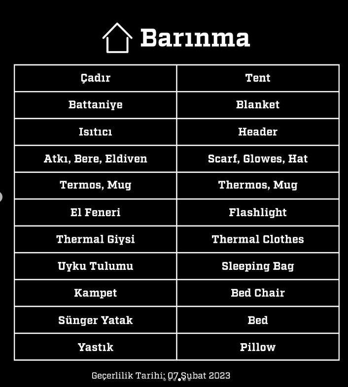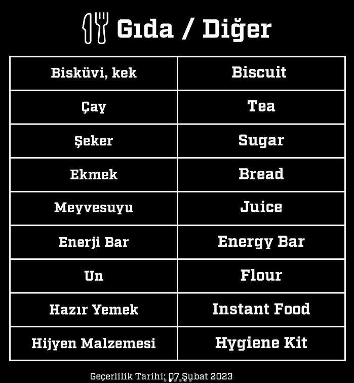 Geçtiğimiz gün meydana gelen 7.7 ve 7.6 büyüklüğündeki iki şiddetli Kahramanmaraş depremi bölgede büyük yıkıma yol açtı.Hatay, Adana, Osmaniye, Malatya, Diyarbakır, Gaziantep, Adıyaman, Şanlıurfa ve Kilis'te de etkili olan deprem sonrası göçük altında kalanları kurtarma çalışmaları tüm hızıyla devam ediyor.Türkiye’nin dört bir yanından ise bölgedeki depremzedelere yardım etmek isteyen vatandaşlar çeşitli kurum ve kuruluşlar aracılığıyla yardımlarını ulaştırmaya devam ediyor. Bunların başında da Afet ve Acil Durum Yönetim Başkanlığı (AFAD) geliyor.Yapılan açıklamalarda bölgede acil olarak aşağıdaki malzemelere ihtiyaç duyuluyor.Battaniye, çadır, ekmek, su, yağmurluk, mat, elektrikli ısıtıcı, konserve hazır gıda, enerji verici gıdalar (çikolata ve kek gibi), soğuk sandviç, meyve suyu, ışıldak, bebek bezi, hijyen malzemeleri, mont, bot.