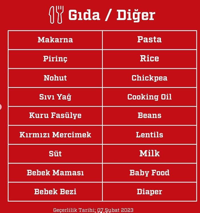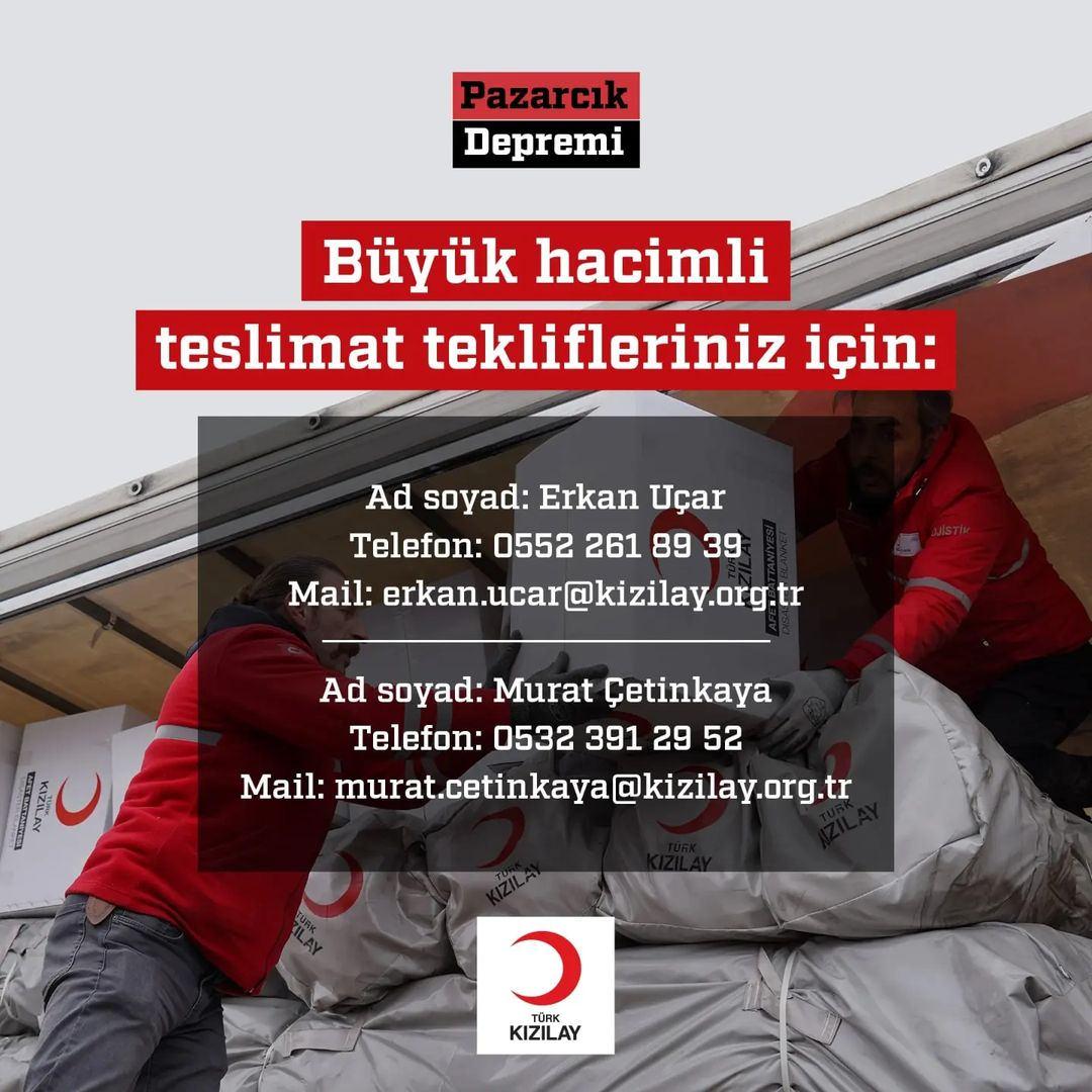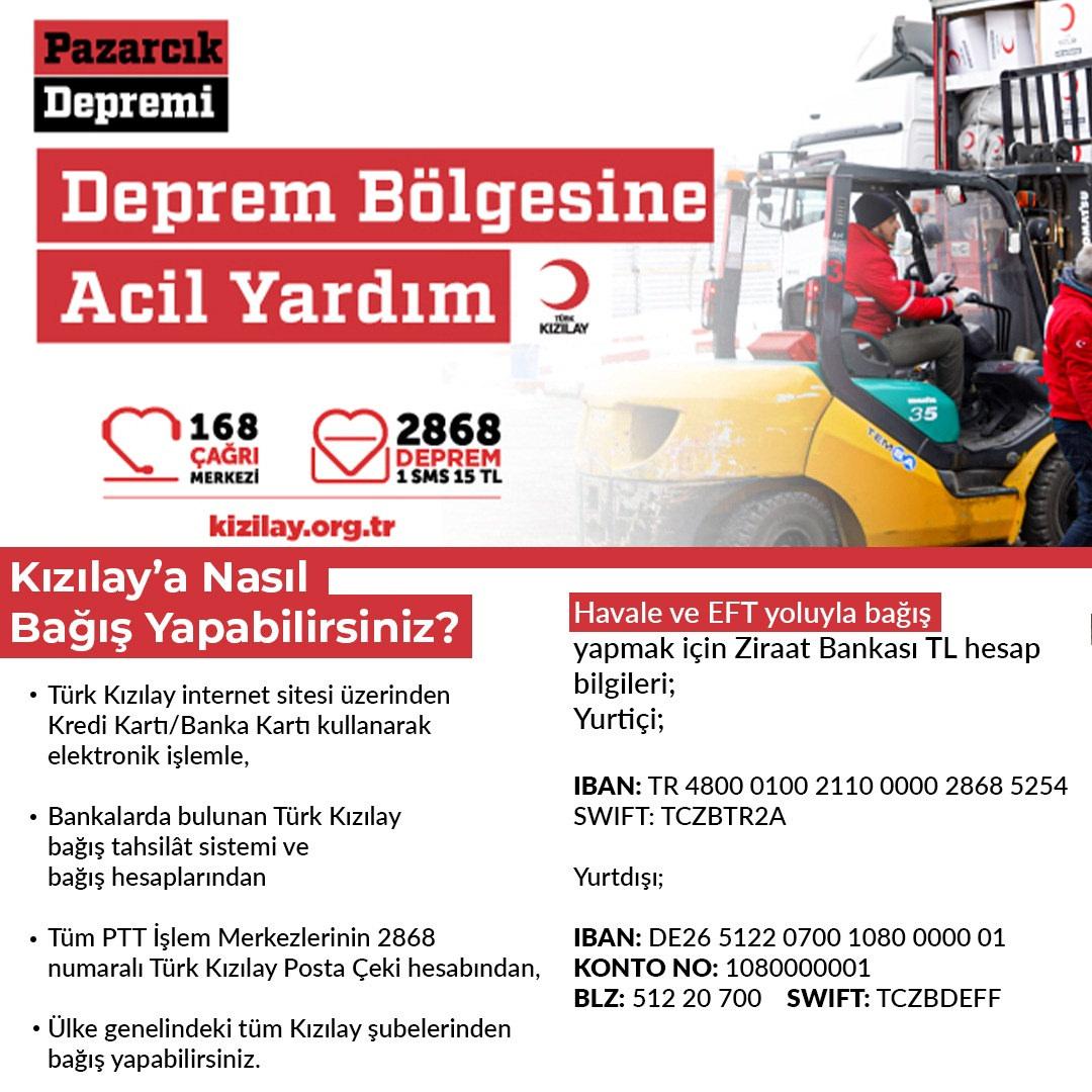 Türk Kızılay, depremin ardından Kahramanmaraş ve depremden etkilenen tüm bölgeler için yardım malzemesi sevkiyatını başladı.Kızılay'ın internet sitesinden yapılan açıklamada şu ifadelere yer verildi:Gıda, barınma vb. yardımlarımızla daha fazla depremzedeye ulaşmak ve yanlarında olmak için desteğinize ihtiyaç var. İstediğiniz tutarda bağış yaparak siz de depremzedelerimize yardım eli uzatabilirsiniz.“DEPREM” yazıp 2868'e SMS yollayarak 15₺ bağışta bulunabilir; banka yoluyla bağış yapmak için hesap numaralarımıza aşağıdaki linkten ulaşabilirsiniz: