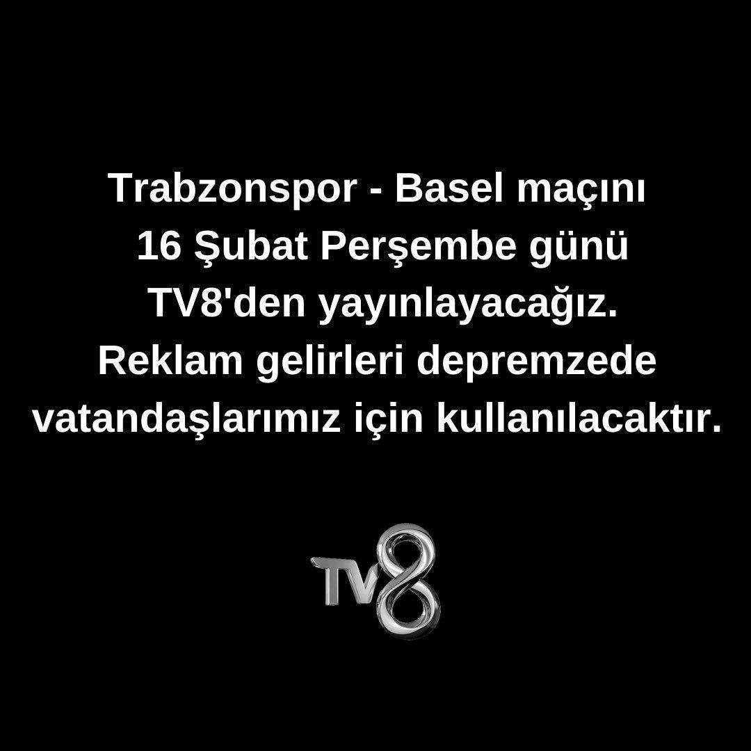 TV8 ve Acun Medya'nın sahibi Acun Ilıcalı, 16 Şubat Perşembe günü saat 20.45'te oynanacak olan Trabzonspor-Basel maçını yayınlayacak kanalı açıkladı.Sosyal medya hesabından bir duyuru yapan Ilıcalı, "Trabzonspor - Basel maçını 15 Şubat Perşembe günü TV8'den yayınlayacağız. Reklam gelirleri depremzede vatandaşlarımız için kullanılacaktır" ifadelerini kullandı. Bilindiği üzere, UEFA karşılaşmalarını Exxen platformu üzerinden şifreli yayınlanıyordu.