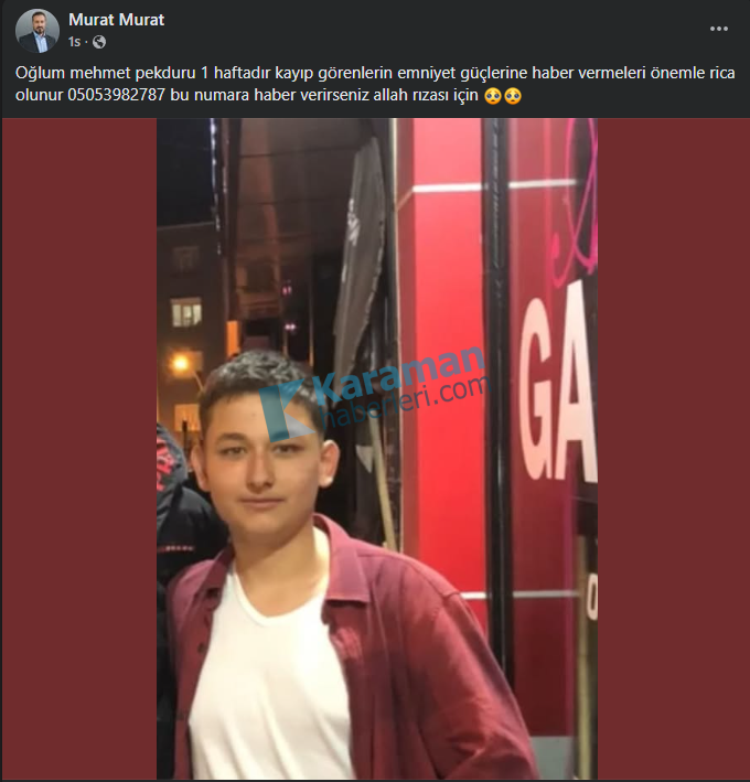 Karaman'da 17 yaşındaki Mehmet Pekduru'dan 1 haftadır haber alınamıyor. Ailesi kayıp çocuklarının bulunması için vatandaşlardan yardım istedi.Edinilen bilgilere göre günlerdir kayıp olan Mehmet Pekduru’yu gören ya da yerini bilen vatandaşların 0505 398 27 87 numaralı telefon üzerinden aileye ulaşmaları veya en yakın emniyet birimine bilgi vermeleri istendi.Yetkililerin kayıp başvurusu üzerine çalışmaları devam ediyor.