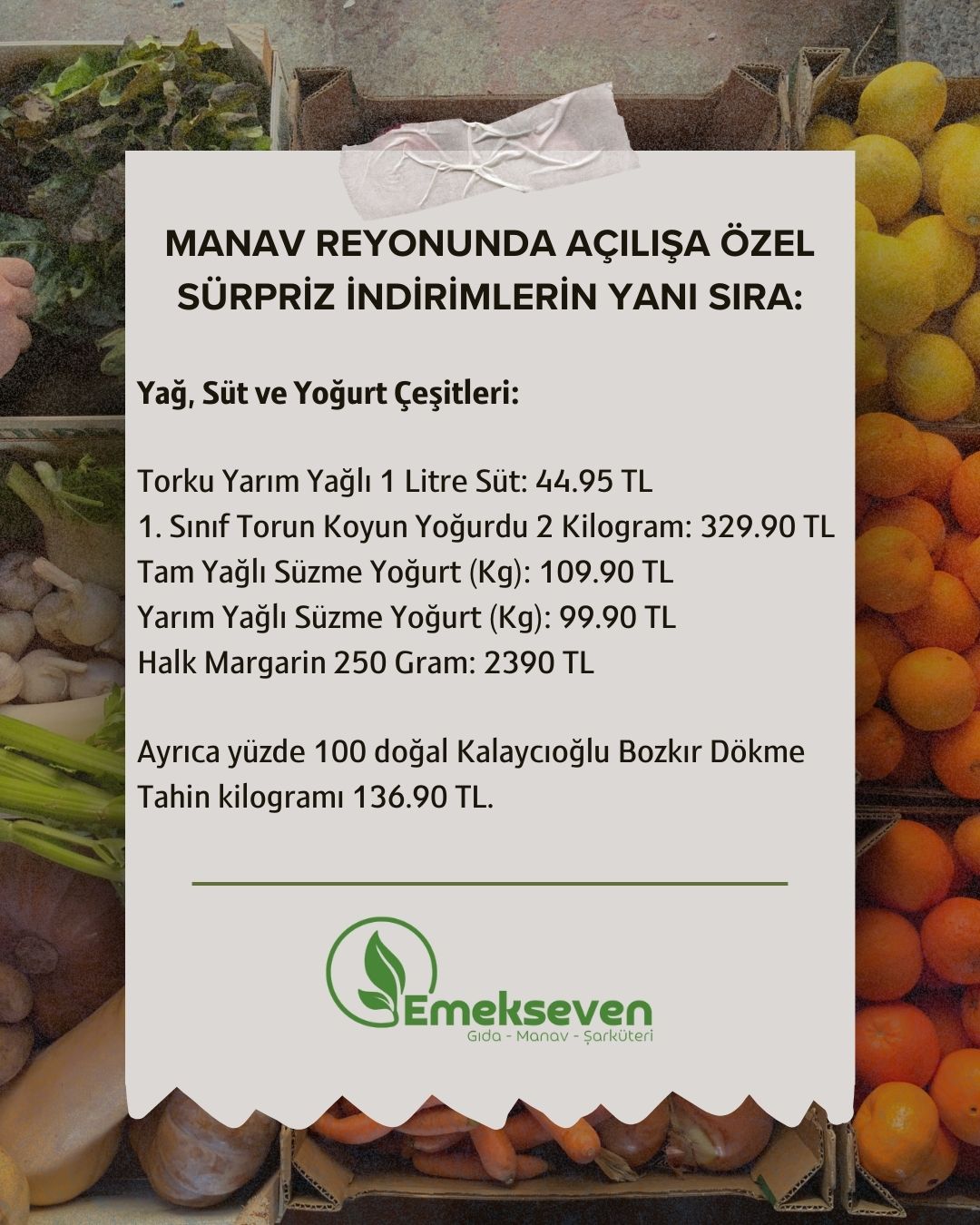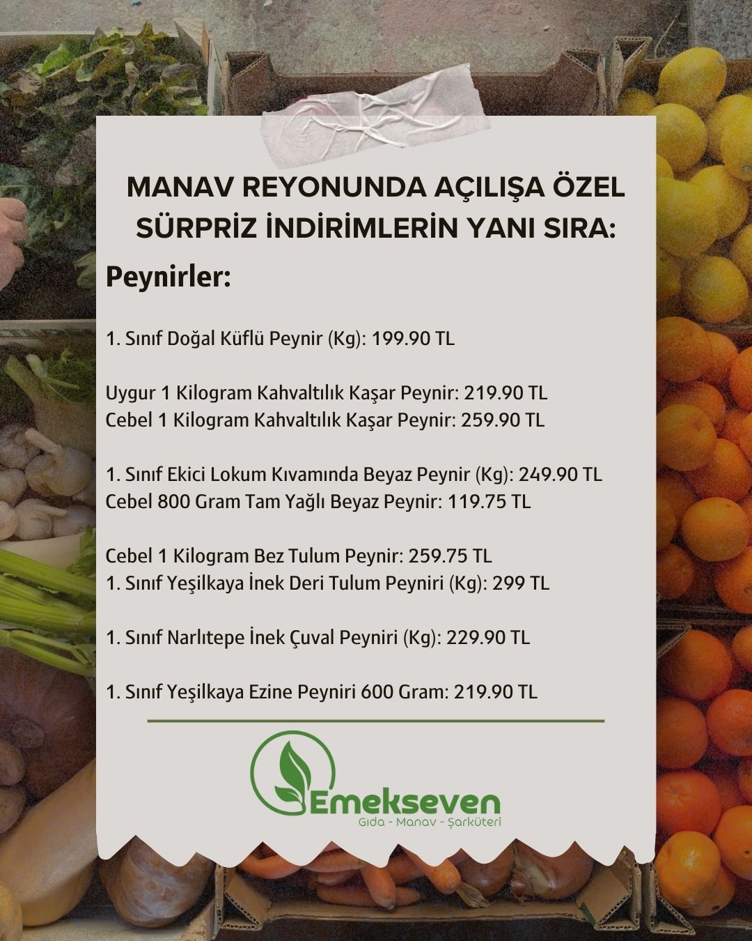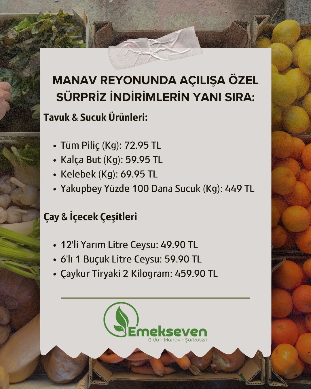 Emekseven Gıda’da açılışa özel fiyat indirimleri de uygulanacak. Uygun fiyat, kaliteli ürün ve geniş reyon seçenekleriyle hizmet verecek olan Emekseven Gıda’nın, Karaman halkından yoğun ilgi görmesi bekleniyor.Özellikle manav reyonunda dev indirim sürprizleri hazırlayan Emekseven Gıda'nın açılışa özel belirlediği fiyatlar şu şekilde:Tavuk & Sucuk Ürünleri:- Tüm Piliç (Kg): 72.95TL