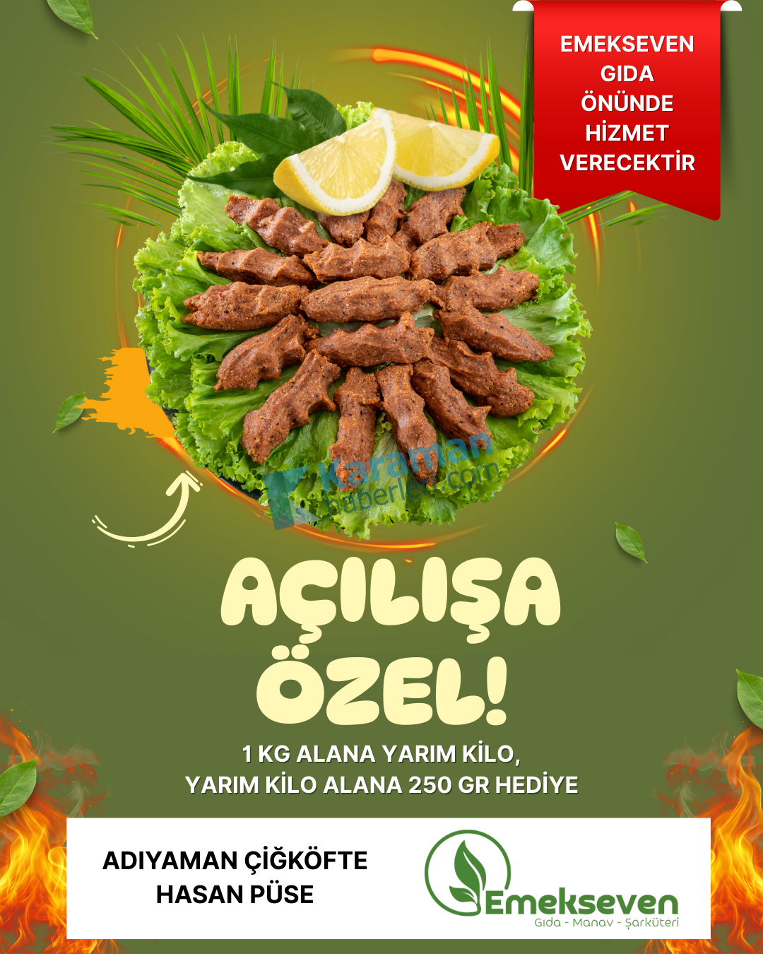 Adıyaman Çiğköfte Hasan Püse, Emekseven Gıda önünde gerçekleştireceği açılışa özel kampanyasıyla vatandaşları lezzetle buluşturuyor. Açılışa özel hazırlanan kampanya kapsamında, 1 kilo çiğköfte alana yarım kilo, yarım kilo alana ise 250 gram çiğköfte hediye edilecek.