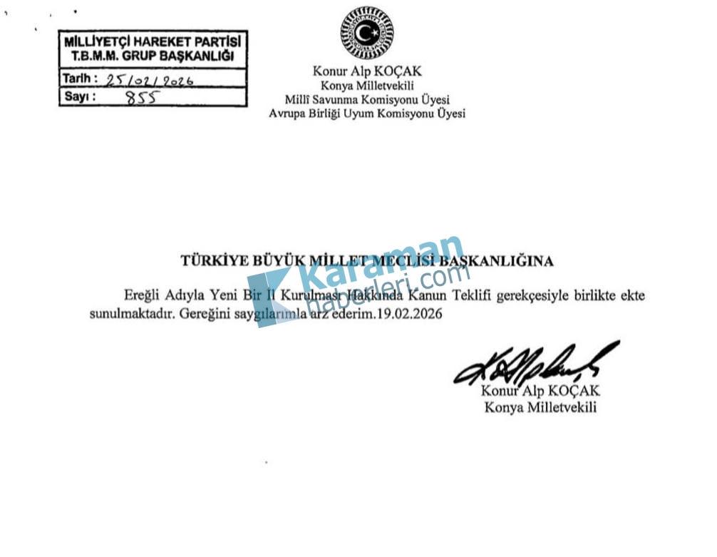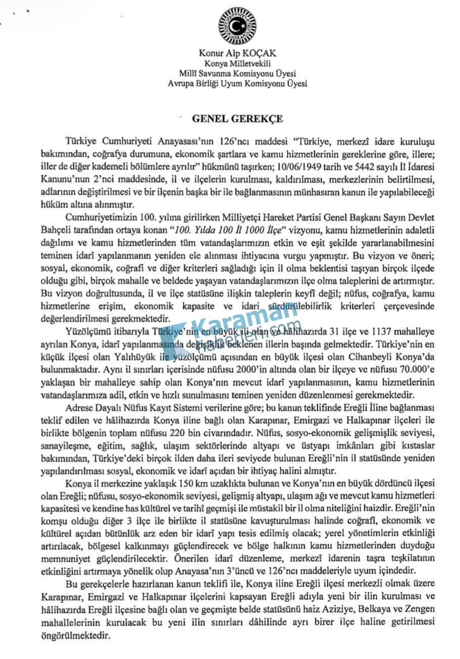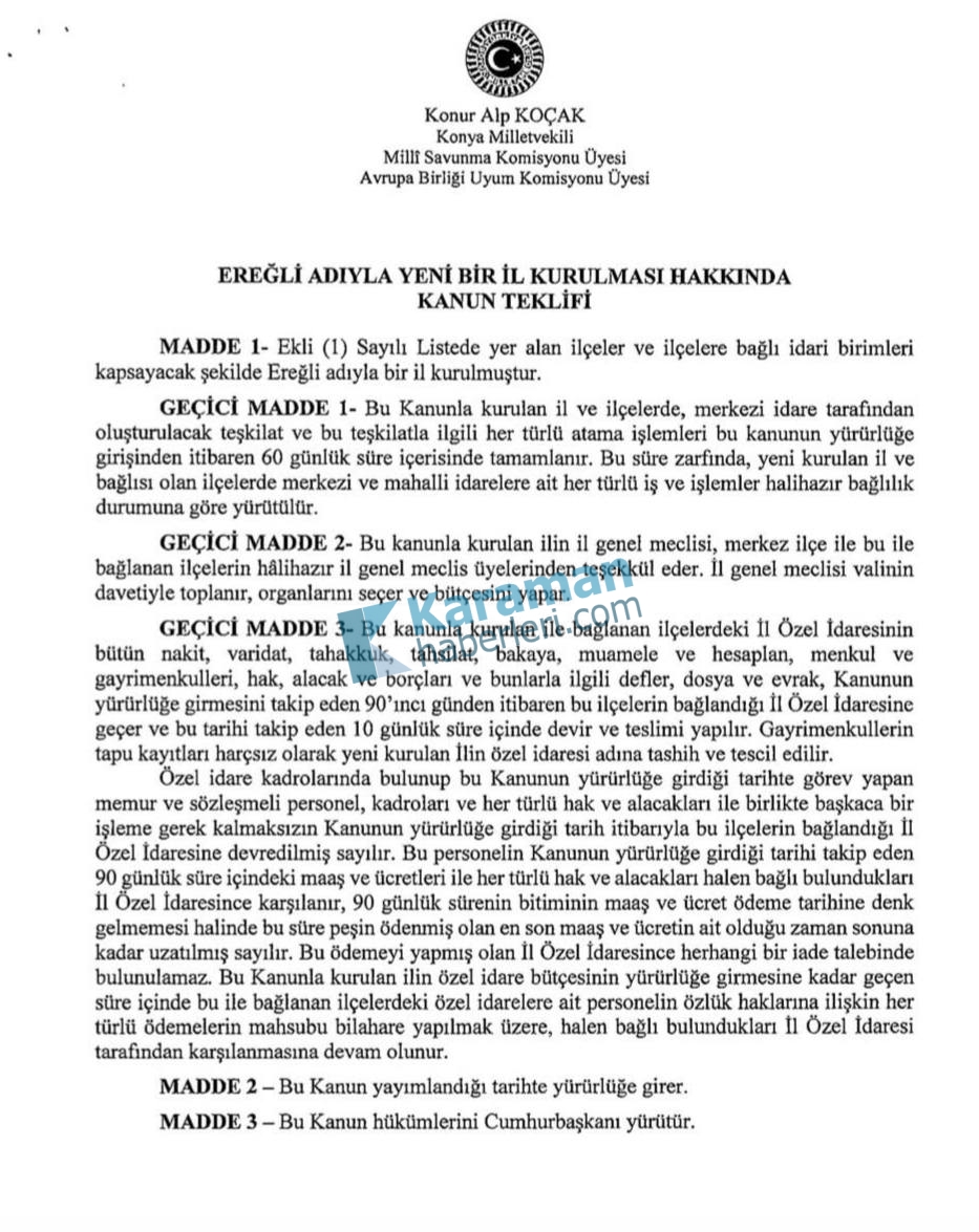 Milliyetçi Hareket Partisi (MHP) Konya Milletvekili Konur Alp Koçak, Konya’nın en büyük ilçelerinden biri olan Ereğli’nin il statüsüne kavuşması amacıyla Türkiye Büyük Millet Meclisi’ne (TBMM) kanun teklifi sundu.