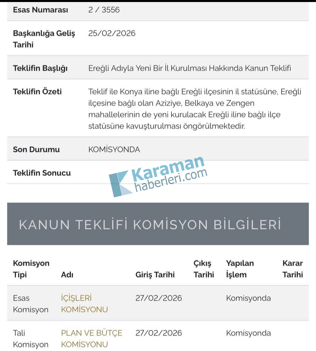 Sunulan kanun teklifine göre, mevcut durumda Ereğli ilçesine bağlı olan Aziziye, Belkaya ve Zengen mahallelerinin ilçe statüsüne yükseltilmesi planlanıyor. Böylece yeni kurulacak Ereğli ili, daha güçlü bir idari yapıya kavuşacak.
