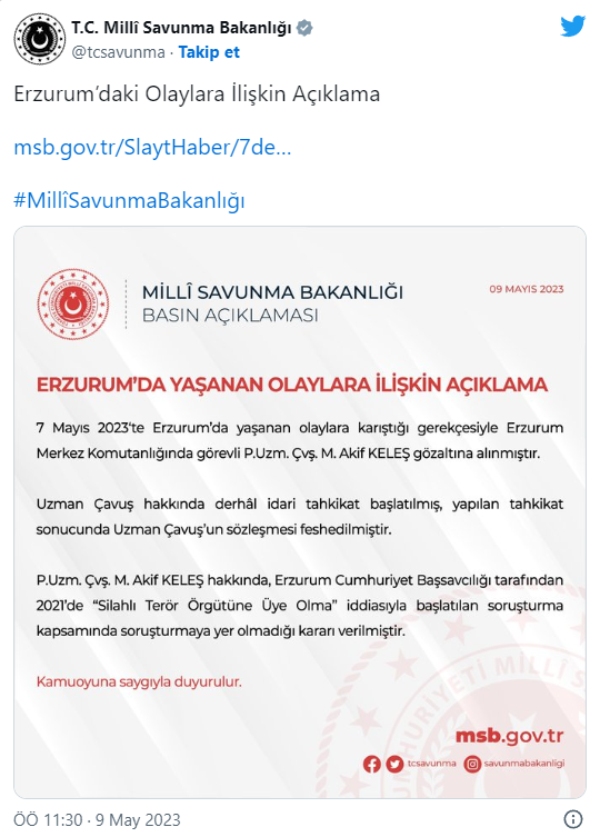 MSB: 7 Mayıs'ta Erzurum'da yaşanan olaylara karıştığı gerekçesiyle Uzman Çavuş Akif Keleş gözaltına alındı, yapılan tahkikat sonucunda sözleşmesi feshedildi.