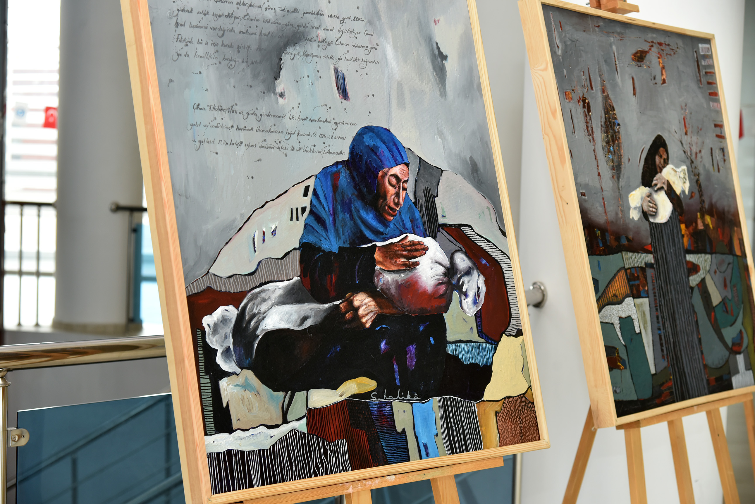KMÜ Sağlık, Kültür ve Spor Daire Başkanlığı fuaye alanında gerçekleştirilen serginin açılışı Rektör Prof. Dr. Mehmet Gavgalı, Rektör Yardımcısı Prof. Dr. Mahmut Baykan, Sanat, Tasarım ve Mimarlık Fakültesi Dekanı Prof. Dr. Mustafa Diğler tarafından yapıldı.Serginin açılışını gerçekleştiren Rektör Prof. Dr. Mehmet Gavgalı, dünyada her zaman savaş olduğunu ve halen devam ettiğini, mağdur olanların ise hep kadınlar, çocuklar ve yaşlılar olduğunu vurgulayarak, “Barış içinde yaşamak isteyen toplumlar, medeniyiz diyen ama medeniyetten nasibini almamış insanlar yüzünden mağdur oluyor. Allah, Gazze’deki mazlumlara yardım etsin.” dedi. Sanat, Tasarım ve Mimarlık Fakültesi Resim Bölümü Öğretim Üyesi Doç. Dr. Murat Aksoy tarafından hazırlanan ve 21 parçadan oluşan sergi, Gazze’de yaşanan dramı kadınlar üzerinden anlatmayı hedefliyor. Tuval üzerine akrilik ve karışık teknikle yapılan çalışmalarda Gazzeli kadınların parçalanmış dünyaları, tuval üzerine bölünmüş yüzeyler olarak yansıyor. Sanatın yalnızca estetik hazla sınırlandırılmaması, işlevsel yönünün de olması gerektiğini belirten Aksoy, çalışmalarıyla izleyicide sanat aracılığıyla bir farkındalık oluşturmaya çalışıyor.Sergiyi ziyaret etmek isteyenler, KMÜ SKS fuaye alanında 23-30 Aralık 2024 tarihleri arasında gezebilecek.