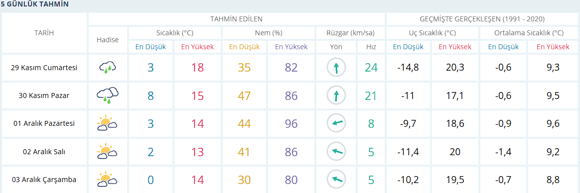 Karaman merkez için hazırlanan 5 günlük tahminler şöyle: