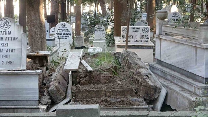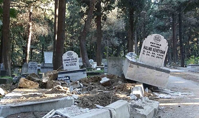 Kahramanmaraş’ta meydana gelen 2 depremin ardından Hatay’da yüzlerce bina yıkılırken binlerce binada ise hasar oluştu. Depremin yıkıcı etkisi sadece binalara olmazken Antakya Asri Mezarlığı'nda bazı mezarlarda hasar oluşurken bazılarının da yola uçtuğu görüldü. Yakınlarının mezarına ziyarete gelen bazı vatandaşlar depremden sonra yola gelen mezarları görünce şaşkına döndü.Açılan mezarlar ise iş makinalarının yardımıyla kapatılıyor.