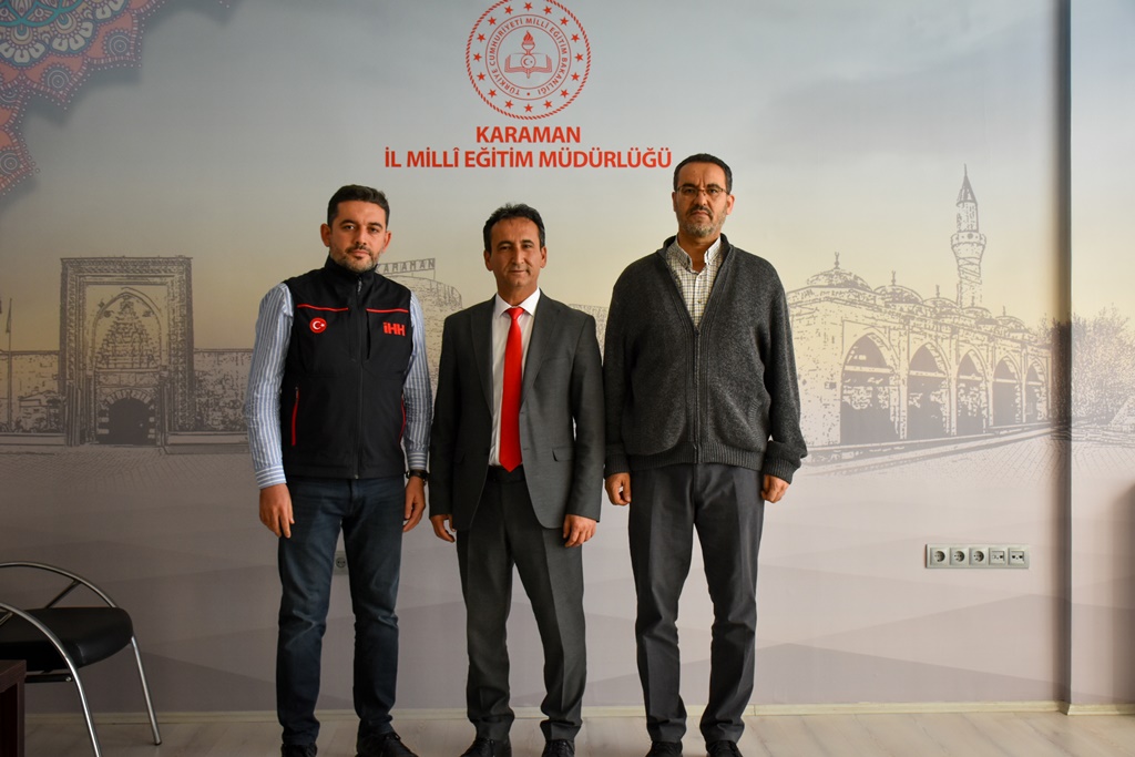 İHH Karaman Şubesi Başkanı Mustafa Köseoğlu ve Yetim Birimi’nin yeni sorumlusu Sefer Ceyhan, Karaman İl Millî Eğitim Müdürü Mehmet Çalışkan’ı ziyaret etti. Ziyarette, Millî Eğitim Bakanlığı ile İHH İnsani Yardım Vakfı arasında imzalanan işbirliği protokolü kapsamında yürütülen "Her Sınıfın Yetim Kardeşi Var" projesi üzerine kapsamlı görüşmeler gerçekleştirildi.