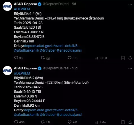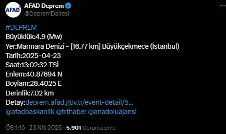 23 Nisan 2025 günü, İstanbul ve çevresinde yaşayan vatandaşlar, Marmara Denizi Silivri açıklarında meydana gelen güçlü depremlerle büyük bir panik yaşadı. İlk sarsıntı saat 12.13'te 3.9 büyüklüğünde kaydedilirken, kısa bir süre sonra art arda yaşanan daha büyük depremler endişeyi artırdı.