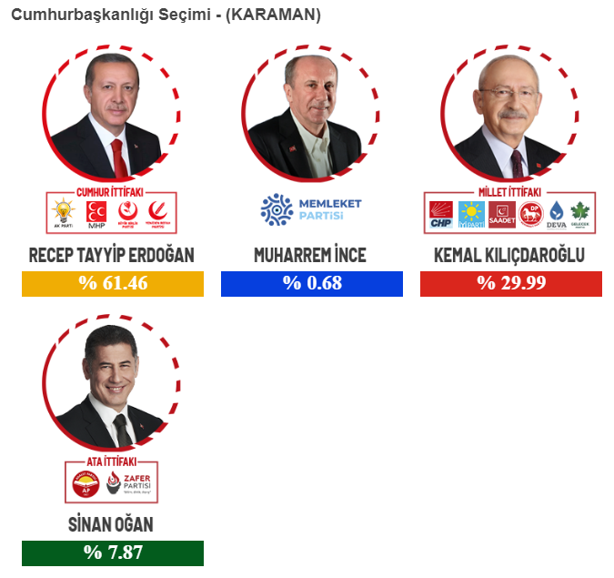 Milletvekili seçiminin yanı sıra, cumhurbaşkanlığı için de Karaman'da Cumhur İttifakı üstün geldi. Cumhur İttifakının adayı Recep Tayyip Erdoğan, Karaman'da en yakın rakibi Millet İttifakı adayı Kemal Kılıçdaroğlu'na 2 kat fark atarak üstün geldi.