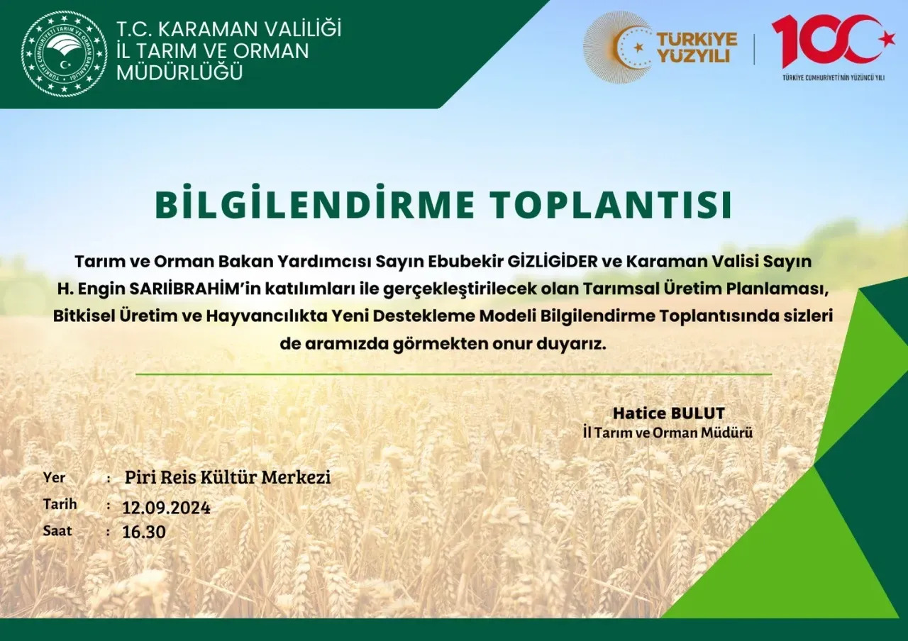 Tarım ve Orman Bakanlığı tarafından düzenlenen "Tarımsal Üretim Planlaması ve Yeni Destekleme Modeli" bilgilendirme toplantısı, 12 Eylül 2024 tarihinde Karaman'da gerçekleştirilecek. Piri Reis Kültür Merkezi'nde saat 16.30'da başlayacak etkinlikte,