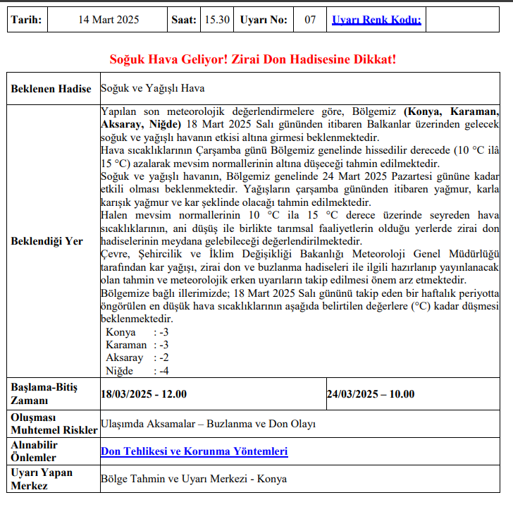 Meteoroloji Genel Müdürlüğü’nün yaptığı değerlendirmelere göre, hava sıcaklıklarında ani bir düşüş yaşanacak ve bölgede kar yağışı görülecek.Sıcaklıklar 10-15 Derece DüşecekÖzellikle Çarşamba gününden itibaren sıcaklıkların 10 ila 15 derece birden düşerek mevsim normallerinin altına inmesi bekleniyor. 24 Mart 2025 Pazartesi gününe kadar devam etmesi öngörülen soğuk hava dalgası, bölgede yoğun kar yağışı ve don olaylarına neden olabilir.Zirai Don Riski Üreticileri EndişelendiriyorMevsim normallerinin üzerinde seyreden hava sıcaklıklarının ani düşüşü, tarımsal üretim yapan çiftçiler için büyük bir risk oluşturuyor. Özellikle meyve ve sebze üreticilerinin zirai don tehlikesine karşı gerekli önlemleri alması gerektiği belirtiliyor. Uzmanlar, sera üreticilerinin ısıtma sistemlerini kontrol etmeleri ve açık alanlardaki mahsulleri koruyacak tedbirler alması gerektiğini vurguluyor.Gece Sıcaklıkları Sıfırın Altına DüşecekBölgede beklenen en düşük sıcaklıklar şu şekilde olacak: Konya: -3°C Karaman: -3°C Aksaray: -2°C Niğde: -4°CUlaşımda Aksamalar ve Buzlanma TehlikesiMeteoroloji yetkilileri, özellikle yüksek kesimlerde kar yağışının etkili olacağını bildirerek, sürücüleri dikkatli olmaya davet etti. Buzlanma ve don olaylarının ulaşımı olumsuz etkileyebileceği, bu nedenle vatandaşların kış lastiği kullanımı ve zincir gibi ek önlemler almasının önemli olduğu belirtildi.Yetkililerden Erken Uyarılar GelecekÇevre, Şehircilik ve İklim Değişikliği Bakanlığı Meteoroloji Genel Müdürlüğü, önümüzdeki günlerde kar yağışı, buzlanma ve zirai don ile ilgili erken uyarılar yayımlayacağını açıkladı. Vatandaşların ve üreticilerin bu uyarıları dikkate alarak gerekli tedbirleri alması büyük önem taşıyor.Karaman ve çevresinde yaşayanların, hava şartlarına uygun hazırlık yapmaları, trafikte dikkatli olmaları ve tarımsal üretimde korunma yöntemlerini devreye sokmaları gerekiyor. Yetkililer, vatandaşların gelişmeleri takip etmelerini ve olumsuz hava koşullarına karşı hazırlıklı olmalarını öneriyor.