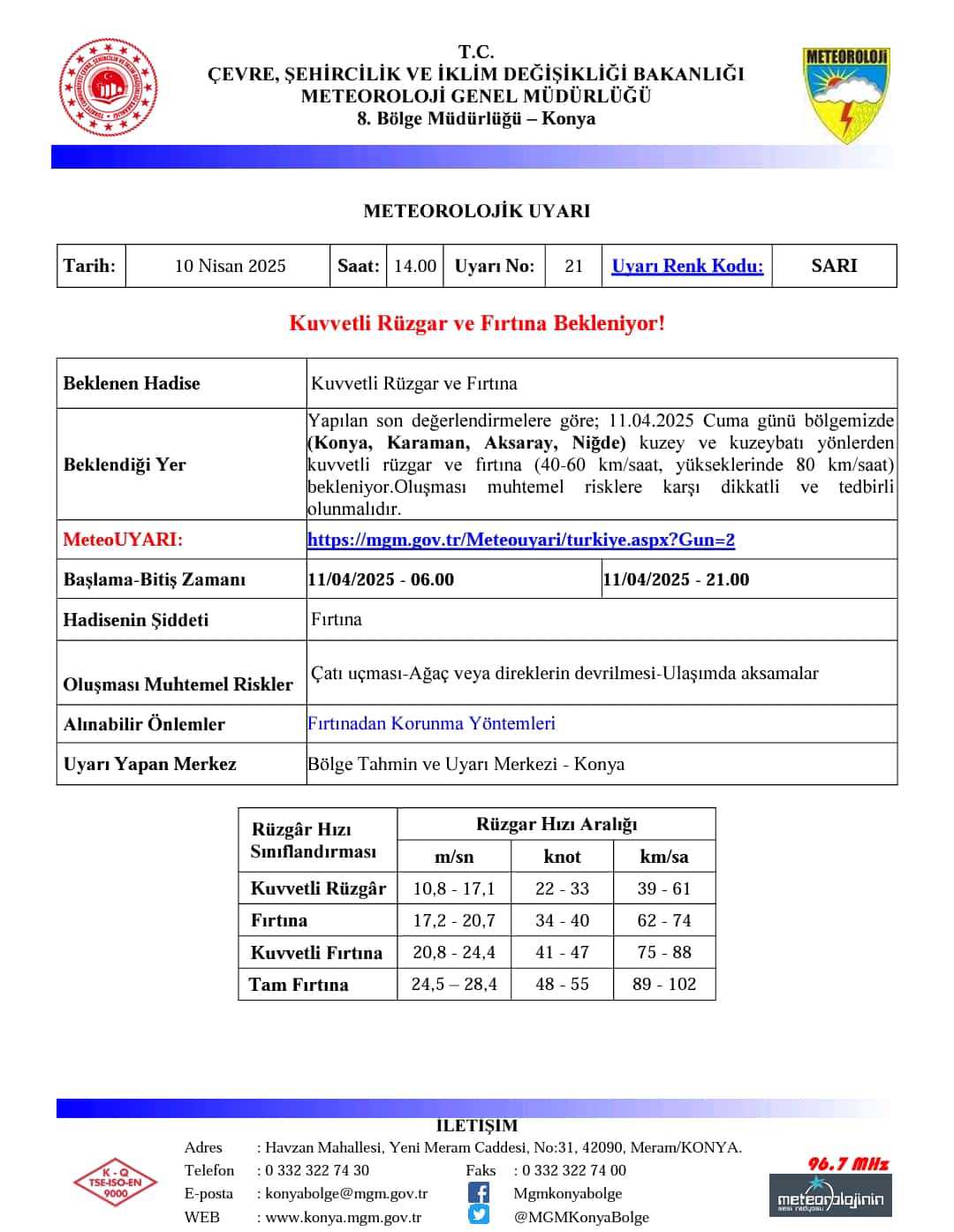 Karaman'da hava sıcaklıkları mevsim nomrallerinde seyrederken, hava sıcaklıklarında yaşanan ani düşüş sonrası kentte kar yağışı etkili oldu.Kar yağışı sonrasında ise yine Meteoroloji 8. Bölge Müdürlüğü'nde yapılan son değerlendirmelerle Karaman'a sarı kodlu uyarı geldi. Yapılan son değerlendirmelere göre, 11 Nisan Cuma günü bölgemizde (Karaman, Konya, Aksaray ve Niğde) kuzey ve kuzeybatı yönlerden kuvvetli rüzgar ve fırtına (40-60 km/saat, yükseklerde 80 km/saat) bekleniyor.Oluşması muhtemel risklerden çatı uçması, ağaç ve direklerin devrilmesi, ulaşımda aksamalara karşı tedbirli olunması gerektiği vurgulandı.