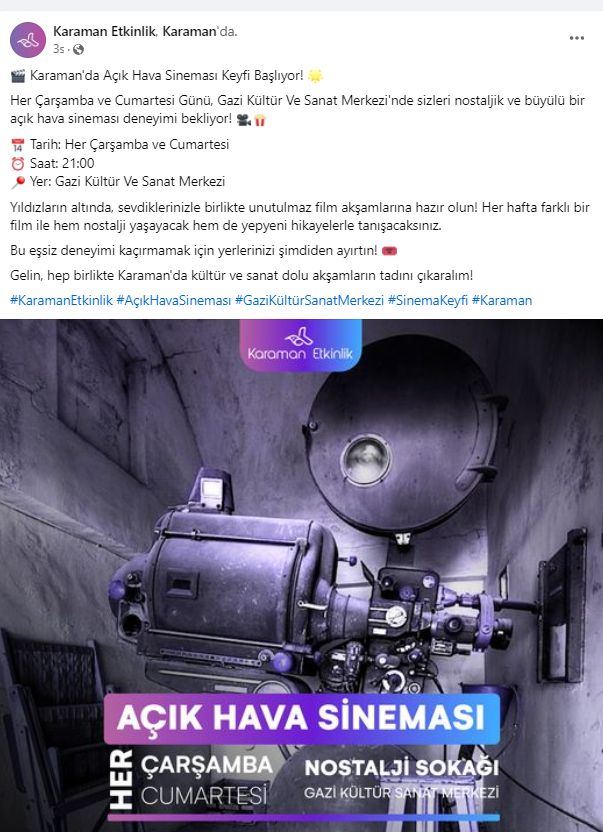 Karaman'da Yeni Etkinlik Dönemi BaşlıyorKaraman'da yaşayan sinemaseverler için heyecan verici bir etkinlik geliyor. Karaman Etkinlik sosyal medya hesabı üzerinden yapılan duyuruda, şehirde açık hava sinemasının düzenleneceği müjdelendi. Karamanlılar, bu yaz akşamlarını Gazi Kültür ve Sanat Merkezi'nde geçirecek ve yıldızların altında nostaljik filmleri izleyerek keyifli saatler geçirecekler.Açık Hava Sineması Ne Zaman ve Nerede?Açık hava sineması etkinliği, Gazi Kültür ve Sanat Merkezi'nde başlayacak. Her çarşamba ve cumartesi akşamları düzenlenecek olan bu etkinlik, saat 21:00'de başlayacak. Her hafta farklı bir nostaljik film gösterimi yapılacak ve bu sayede her ziyaretçi farklı bir sinema deneyimi yaşama fırsatı bulacak. Özellikle yaz akşamlarında açık hava sinemasının keyfini yaşamak isteyen Karamanlılar için bu etkinlik kaçırılmaması gereken bir fırsat olarak değerlendiriliyor.Sinemaseverler İçin Büyülü Bir DeneyimKaraman Etkinlik sosyal medya hesabından yapılan açıklamada, "Karaman’da Açık Hava Sineması Keyfi Başlıyor! Her Çarşamba ve Cumartesi Günü, Gazi Kültür ve Sanat Merkezi’nde sizleri nostaljik ve büyülü bir açık hava sineması deneyimi bekliyor!" denildi. Açıklamada, etkinliğin her hafta farklı bir film sunacağı ve katılımcılara hem geçmişe dair hem de yeni hikayeler sunacağı vurgulandı. "Yıldızların altında, sevdiklerinizle birlikte unutulmaz film akşamlarına hazır olun!" ifadeleriyle etkinliğin coşkusuna dikkat çekildi.Etkinliği Kaçırmayın!Gelin, Karaman'da kültür ve sanat dolu akşamların tadını birlikte çıkaralım! Etkinlik alanında yerlerinizi şimdiden ayırtarak bu eşsiz deneyimi kaçırmayın. Sinemaseverler, açık hava sineması sayesinde hem eski filmlerin tadını çıkaracak hem de sosyal bir etkinlik fırsatını yakalayacaklar.