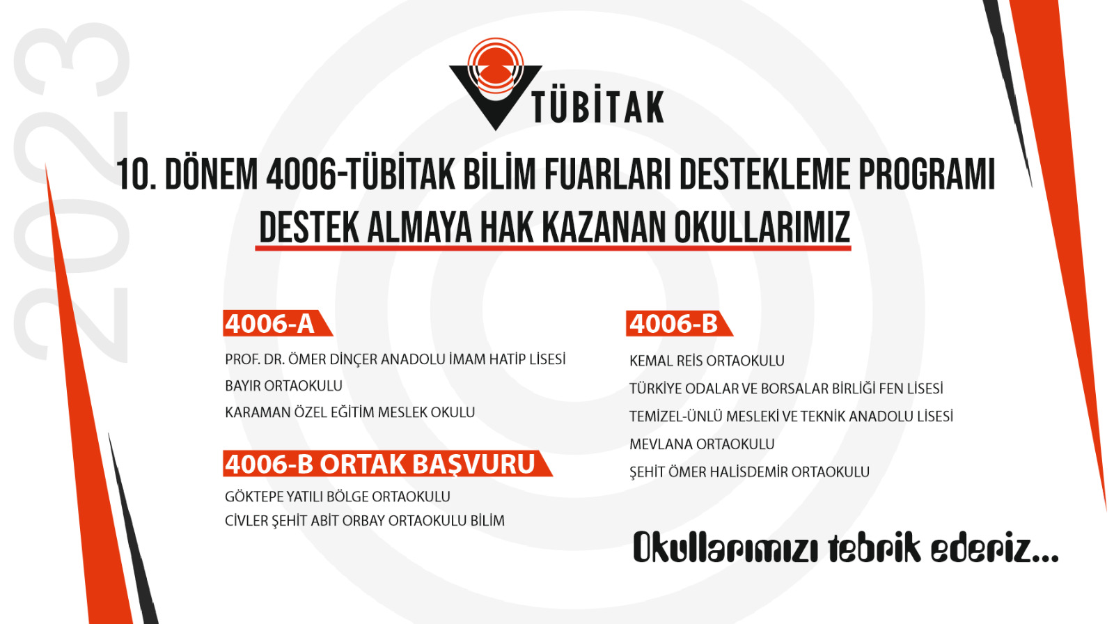 4006-TÜBİTAK 10. Bilim Fuarları kapsamında destek almaya hak kazanan proje listeleri il bazında yayınlandı. 4006-TÜBİTAK Bilim Fuarları Destekleme Programının 10’uncu Dönemi kapsamında 4006-A ve 4006-B çağrı başvurularının değerlendirme süreci sonucunda, programa Karaman’dan 10 okul destek almaya hak kazandı.Millî teknoloji hamlesi çerçevesinde ülkemizin emin adımlarla ilerlediği bilim ve teknoloji yolculuğunda geleceğimizin teminatı gençlerimizin bilimsel proje hazırlama ve sunma deneyimi elde ettikleri 4006-TÜBİTAK Bilim Fuarları Destekleme Programının 10’uncu Dönemi kapsamında 4006-A ve 4006-B çağrılarına yapılan proje başvurularının değerlendirme süreci tamamlandı.81 ilden toplam 3 bin 349 okulda öğrenim gören öğrencilerin hazırlamış olduğu 51 bin 97 proje destek almaya hak kazandı. 4006-TÜBİTAK Bilim Fuarları Destekleme Programının 10. Döneminde A ve B çağrı başvuruları sonucunda İlimizden de 10 okul inceleme sonrasında destekleme almaya hak kazandı. Yapılan değerlendirme neticesinde; Prof. Dr. Ömer Dinçer Anadolu İmam Hatip Lisesi, Bayır Ortaokulu ve Karaman Özel Eğitim Meslek Okulu TÜBİTAK 4006-A bilim fuarı için destek almaya hak kazanırken; Türkiye Odalar ve Borsalar Birliği Fen Lisesi, Temizel-Ünlü Meslekî ve Teknik Anadolu Lisesi, Kemal Reis Ortaokulu, Mevlana Ortaokulu, Şehit Ömer Halisdemir Ortaokulu ile ortak başvuru yapan Göktepe Yatılı Bölge Ortaokulu ve Civler Şehit Abit Orbay Ortaokulu bilim fuarı için destek almaya hak kazanan okullar oldu.