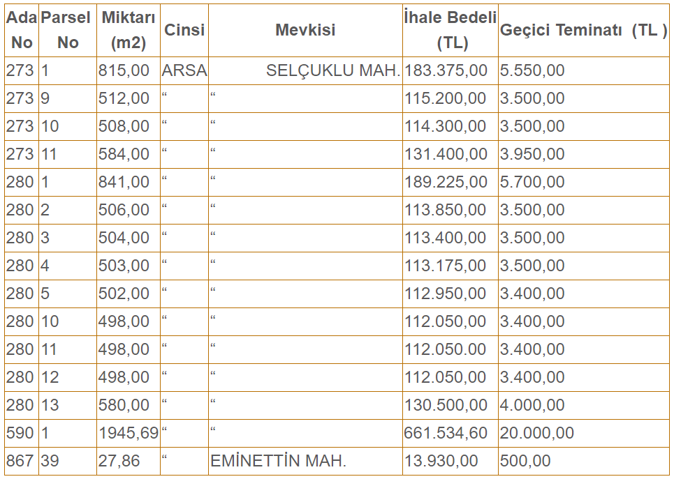 Karaman'ın Kazımkarabekir Belediye Başkanlığı, 15 adet arsanın ihale ile satılacağını duyurdu.Belediyeden yayınlanan ilanda şu ifadelere yer verildi:Belediyemize ait aşağıda tapu bilgileri, nitelikleri ve muhammen bedelleri yazılı taşınmazlar Encümenimizin 28/04/2023 tarih ve 22 sayılı kararı gereği 22/05/2023 Pazartesi günü saat 10.00'da Belediye Başkanlığında ihale komisyonu huzurunda 2886 D.İ.K.nun 45. maddesine göre açık artırma usulü ile ihale edilecektir.İhale sonucuna göre ilk taksiti peşin olarak ikinci ve üçüncü taksitleri ikişer aylık aralıkla toplamda üç taksit olarak ödenecektir. İhaleye katılabilmek için 22/05/2023 Pazartesi ihale günü saat 9:30'a kadar geçici teminat bedelinin tahsilat servisimize ödenmesi, başkası adına ihaleye katılacakların noter tasdikli vekaletname, şirket veya tüzel kişilikler adına katılacakların yetki belgesi ibraz etmeleri gerekmektedir.İhale sonuçlandıktan 15 gün içinde sözleşme için müracaat edilecek ve taşınmaz bedelinin ilk taksiti ödendikten sonra sözleşme imzalanacak olup, son taksit ödemesi yapıldıktan sonra tapu devir işlemleri yapılacaktır. Tapu devir işlemlerinde her türlü vergi ve harçlar alıcıya aittir.