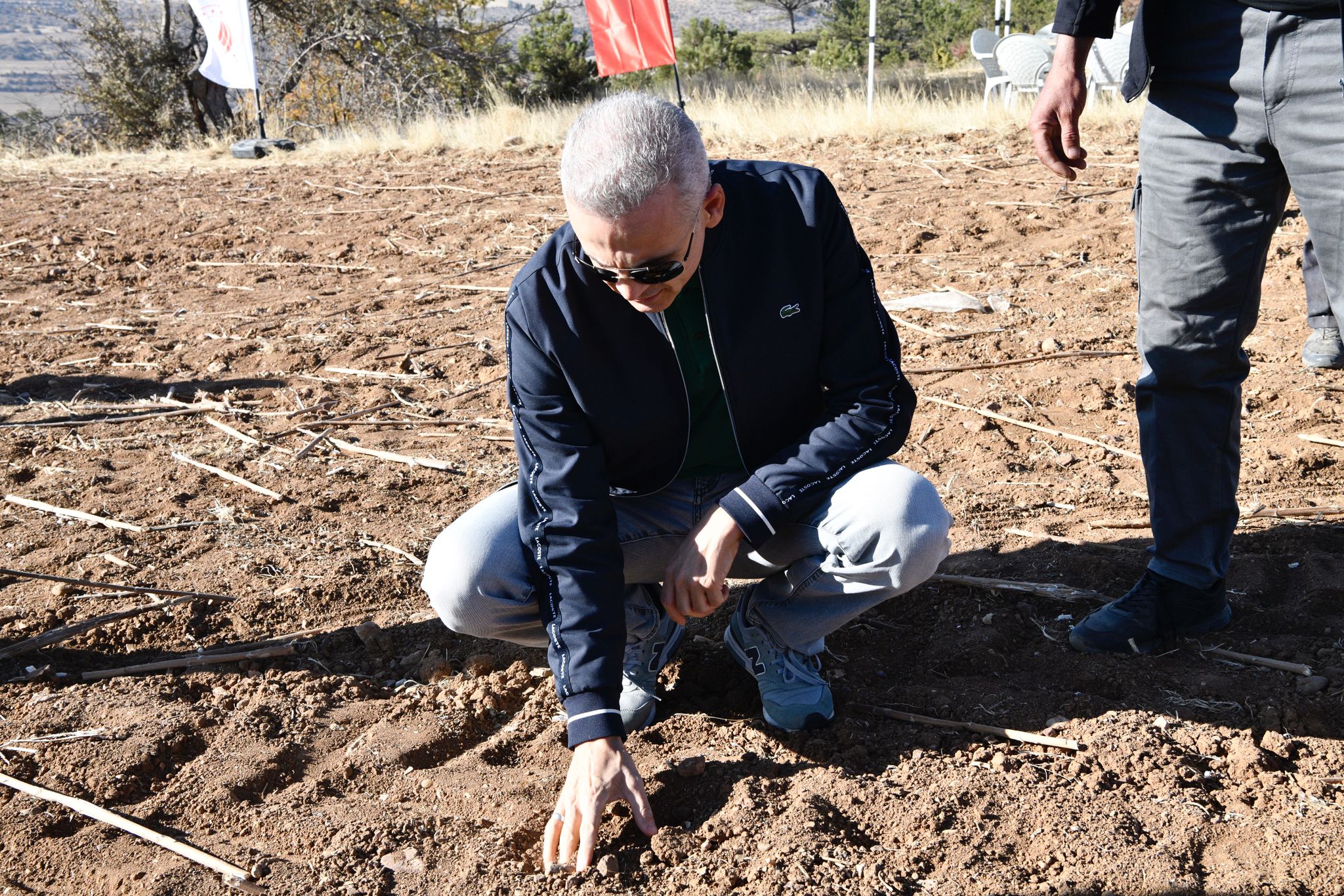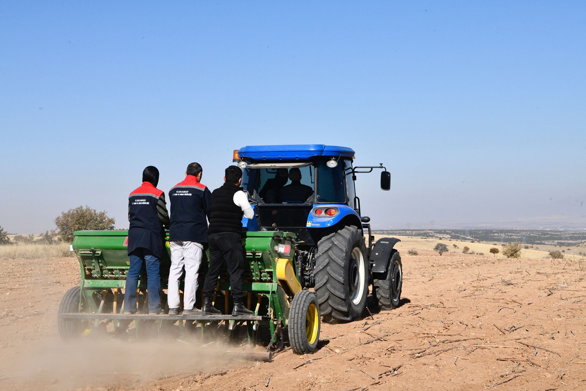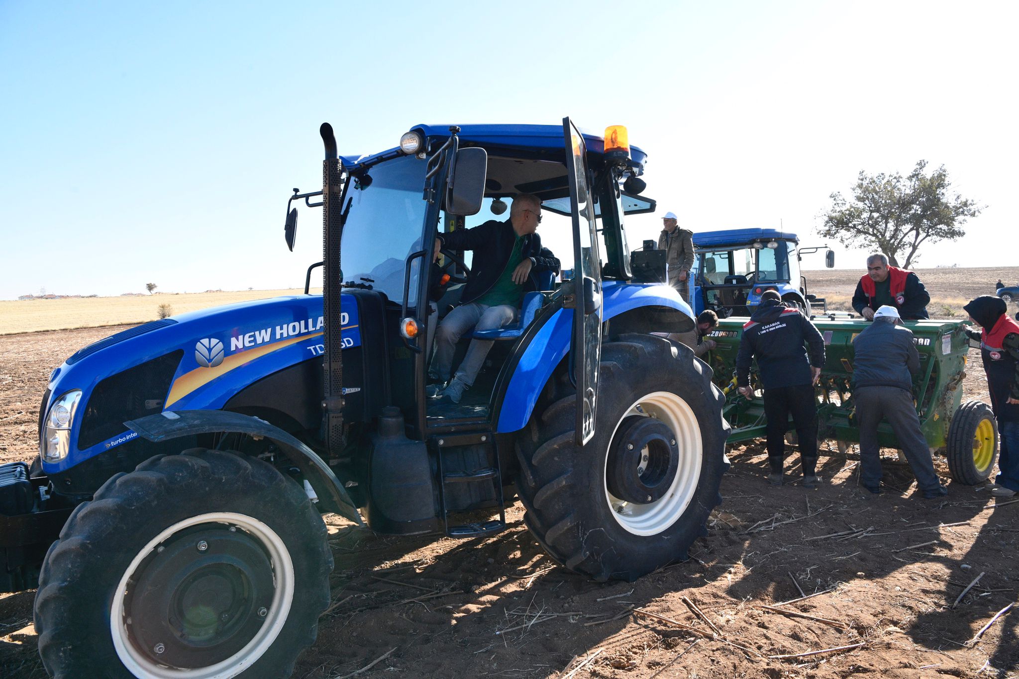 Karaman'daki mevcut buğday türlerinin yerine daha kaliteli ve yüksek verimli 15 farklı buğday türünün ekiminin yapılarak bu çeşitlerin gelişimlerinin izlenmesi amacıyla gerçekleştirilen buğday çeşitleri demonstrasyonu programında Vali Mehmet Fatih Çiçekli, traktörle buğday ekimi yaptı.