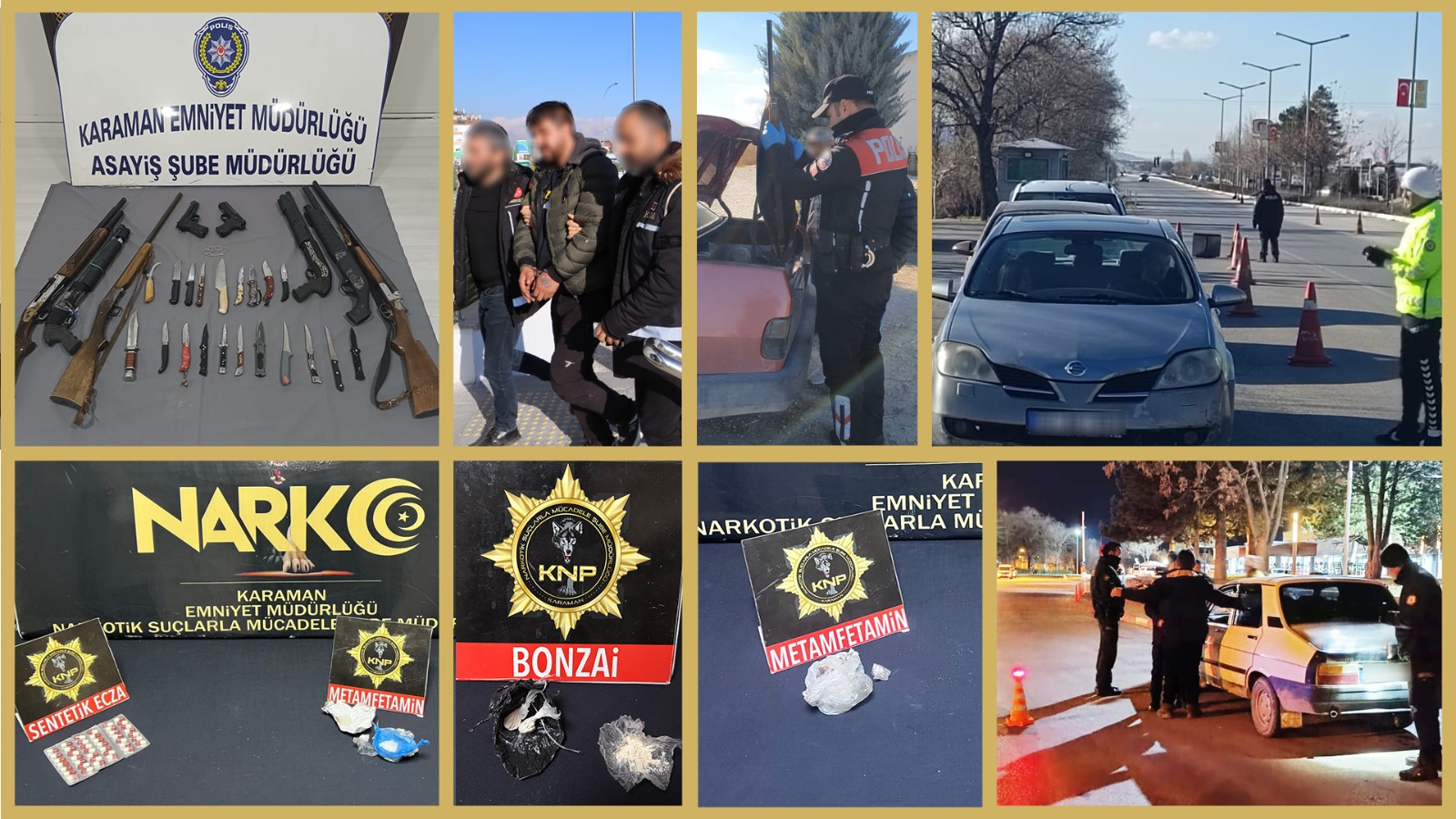 Karaman Emniyet Müdürlüğü tarafından asayiş, narkotik ve trafik olayları başta olmak üzere vatandaşların huzurunu bozacak her türlü suçun engellenmesi, suça karışan şahısların yakalanması amacıyla 30 Aralık 2023 – 05 Ocak 2024 tarihleri arasında asayiş çalışması yürütüldü.Yürütülen çalışmalar neticesinde:• 8069 şahıs sorgulanmış,