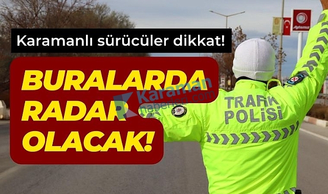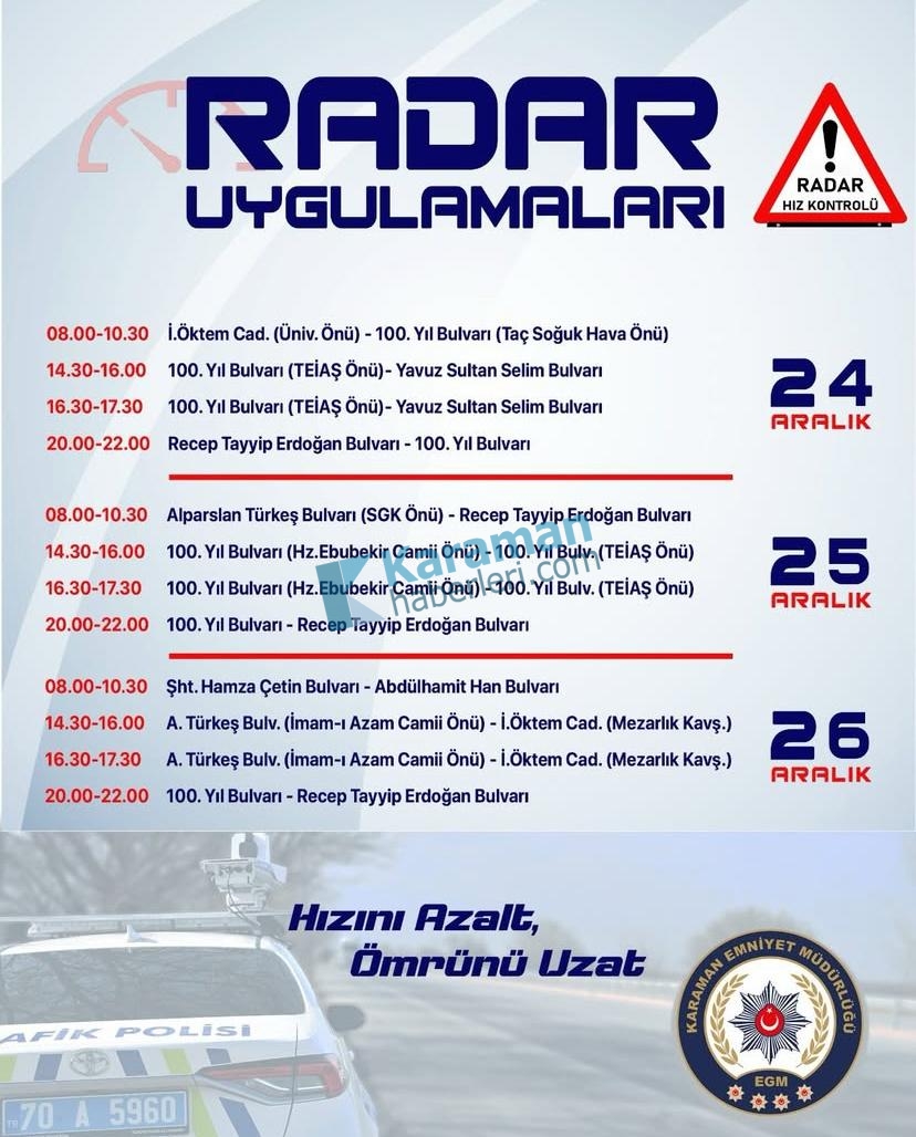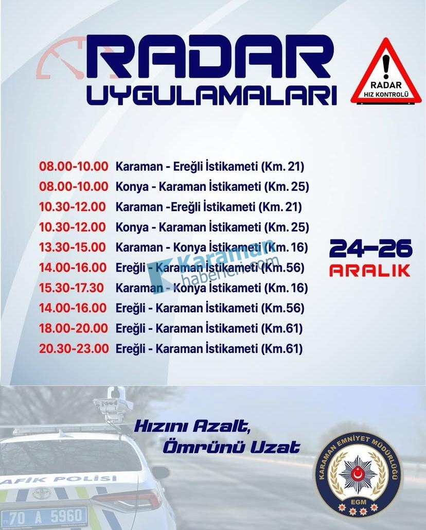 Karaman'da sürücülerin ve yayaların emniyetli bir trafikte hareket edebilmeleri adına hız radar kontrollerini sıklaştıran İl Emniyet Müdürlüğü, 24-26 aralık tarihleri arasında kent merkezinde hız radar kontrolü gerçekleştirilecek noktaları paylaştı.Yapılan bilgilendirmeye göre, Karaman'da şu noktalarda radar denetimi olacak:24 Aralık Çarşamba: