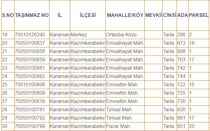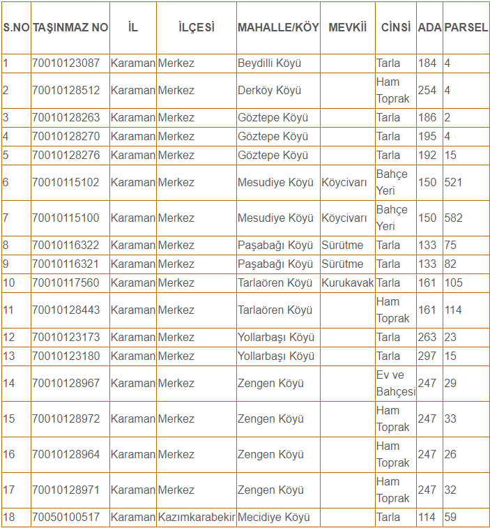 Karaman'da farklı köylerdeki 18 adet taşınmaz ihale ile satılıp, 12 adet taşınmaz ise kiralanacak.Karaman Çevre Şehircilik ve İklim Değişikliği İl Müdürlüğünden (Milli Emlak Müdürlüğü) 30 adet taşınmazın ihale ilanı yayınlandı.