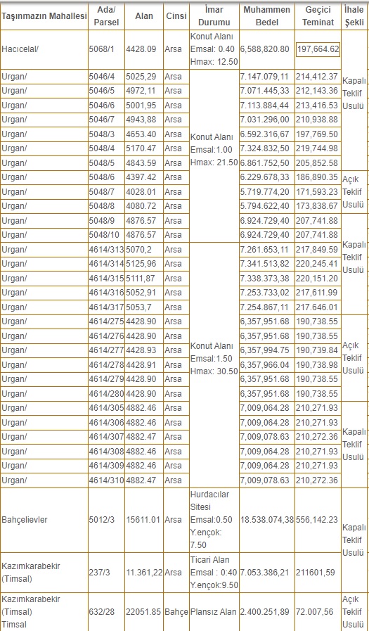 Karaman İl Özel İdaresi, 33 adet taşınmazın ihale ile satılacağını duyurdu.Karaman İl Özel İdaresi Encümen Başkanlığı tarafından yayınlanan ilanda şu detaylar paylaşıldı:Karaman İli Merkez İlçesinde mülkiyeti Karaman İl Özel İdaresine ait olan taşınmazlar 2886 sayılı Devlet İhale Kanunun 45. maddesi gereğince Açık Teklif Usulü ve 35. maddesi gereğince Kapalı Teklif Usulü ile ihale edilerek satışları yapılacaktır.