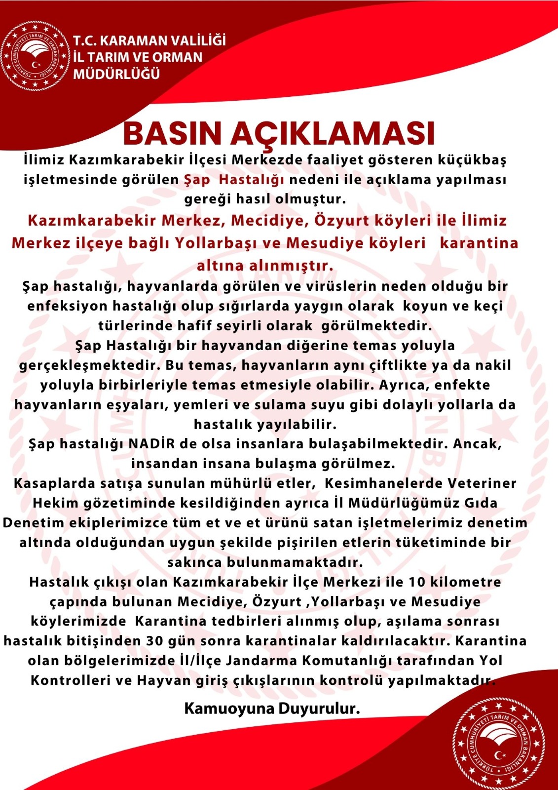 Karaman Tarım ve Orman İl Müdürlüğü'nden konuyla ilgili yapılan açıklamada şu ifadelere yer verildi:"İlimiz Kazımkarabekir İlçesi Merkezde faaliyet gösteren küçükbaş işletmesinde görülen Şap Hastalığı nedeni ile açıklama yapılması gereği hasıl olmuştur. Kazımkarabekir Merkez, Mecidiye, Özyurt köyleri ile İlimiz Merkez ilçeye bağlı Yollarbaşı ve Mesudiye köyleri karantina altına alınmıştır.Şap hastalığı, hayvanlarda görülen ve virüslerin neden olduğu bir enfeksiyon hastalığı olup sığırlarda yaygın olarak koyun ve keçi türlerinde hafif seyirli olarak görülmektedir.Şap Hastalığı bir hayvandan diğerine temas yoluyla gerçekleşmektedir. Bu temas, hayvanların aynı çiftlikte ya da nakil yoluyla birbirleriyle temas etmesiyle olabilir. Ayrıca, enfekte hayvanların eşyaları, yemleri ve sulama suyu gibi dolaylı yollarla da hastalık yayılabilir.Şap hastalığı NADİR de olsa insanlara bulaşabilmektedir. Ancak, insandan insana bulaşma görülmez. Kasaplarda satışa sunulan mühürlü etler, Kesimhanelerde Veteriner Hekim gözetiminde kesildiğinden ayrıca İl Müdürlüğümüz Gıda Denetim ekiplerimizce tüm et ve et ürünü satan işletmelerimiz denetim altında olduğundan uygun şekilde pişirilen etlerin tüketiminde bir sakınca bulunmamaktadır.Hastalık çıkışı olan Kazımkarabekir İlçe Merkezi ile 10 kilometre çapında bulunan Mecidiye, Özyurt ,Yollarbaşı ve Mesudiye köylerimizde Karantina tedbirleri alınmış olup, aşılama sonrası hastalık bitişinden 30 gün sonra karantinalar kaldırılacaktır. Karantina olan bölgelerimizde İl/İlçe Jandarma Komutanlığı tarafından Yol Kontrolleri ve Hayvan giriş çıkışlarının kontrolü yapılmaktadır."