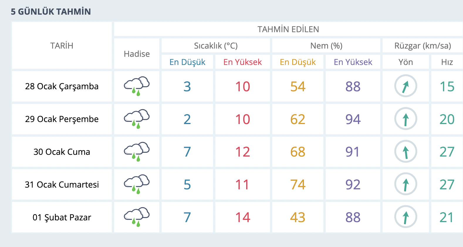 Tahminlere göre 28 Ocak Çarşamba günü kent genelinde yağmur bekleniyor. En düşük sıcaklık 3 derece, en yüksek sıcaklık ise 10 derece olacak. Nem oranı yüzde 54 ile 88 arasında değişirken, rüzgârın saatte 15 kilometre hızla eseceği tahmin ediliyor.