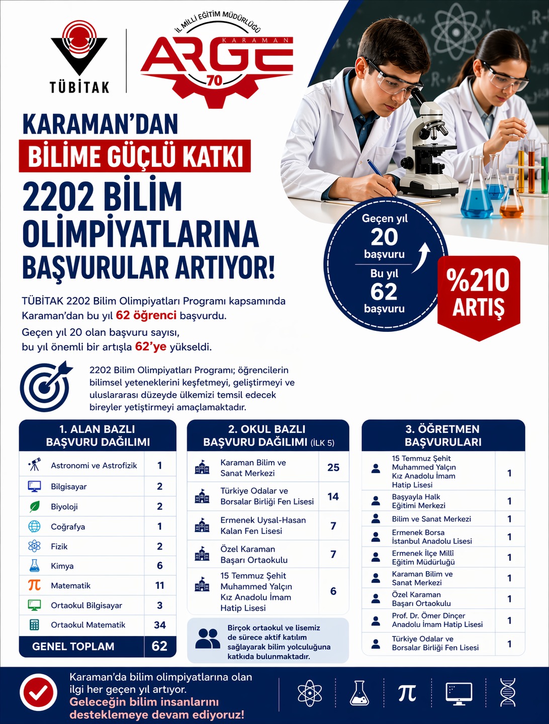 Karaman İl Milli Eğitim Müdürlüğü Strateji Geliştirme Şubesi Ar-Ge Birimi koordinasyonunda yürütülen çalışmalar kapsamında, 2025 yılında 20 olan başvuru sayısı 2026 yılında 62’ye çıktı.BİR YILDA BÜYÜK SIÇRAMABaşvuru sayısındaki artış, Karaman’daki öğrencilerin bilim olimpiyatlarına ilgisinin güçlendiğini ortaya koydu. Eğitim çevreleri, bu yükselişi öğrencilerin araştırma kültürüne yönelmesi açısından önemli adım olarak değerlendiriyor.MATEMATİK İLK SIRADA2026 yılı verilerine göre başvurular yalnızca sayı olarak değil, alan çeşitliliği açısından da gelişti. Özellikle matematik, hem ortaokul hem lise düzeyinde en fazla başvuru yapılan alan oldu.Kimya, fizik, biyoloji ve bilgisayar gibi temel bilim dallarında da dikkat çeken katılım sağlandı.EN ÇOK BAŞVURU BİLSEM’DENOkul bazlı dağılımda Karaman Bilim ve Sanat Merkezi ilk sırada yer aldı. Fen liseleri ile bazı özel okulların da sürece güçlü şekilde katıldığı görüldü.Bu tablo, bilim olimpiyatlarının özellikle akademik başarı odaklı kurumlarda daha fazla sahiplenildiğini gösterdi.ÖĞRETMENLERİN KATKISI ETKİLİ OLDUFarklı okul ve kurumlarda görev yapan öğretmenlerin danışmanlık ve rehberlik faaliyetlerinin de artışta etkili olduğu belirtildi. Öğrencilerin bilimsel alanlara yönlendirilmesinde öğretmenlerin aktif rol oynadığı vurgulandı.KARAMAN İÇİN YENİ HEDEFElde edilen veriler, Karaman’ın bilim olimpiyatlarında daha güçlü bir potansiyele ulaştığını gösterdi. Önümüzdeki dönemde ulusal ve uluslararası düzeyde yeni başarıların hedeflendiği bildirildi.