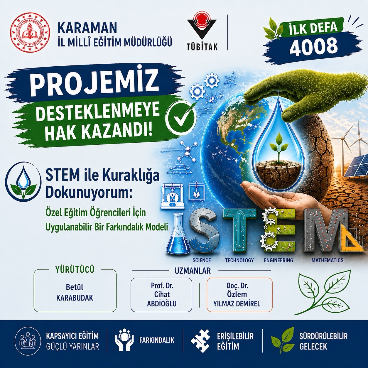 Karaman İl Milli Eğitim Müdürlüğü tarafından hazırlanan “STEM ile Kuraklığa Dokunuyorum: Özel Eğitim Öğrencileri İçin Uygulanabilir Bir Farkındalık Modeli” başlıklı proje, TÜBİTAK 4008 – Özel Gereksinimli Bireylere Yönelik Kapsayıcı Toplum Uygulamaları Destekleme Programı kapsamında desteklenecek.HEM ÖZEL EĞİTİM HEM ÇEVRE FARKINDALIĞIProjeyle özel gereksinimli öğrencilerin aktif katılım sağlayacağı uygulamalı etkinlikler, atölye çalışmaları ve farkındalık programları hayata geçirilecek. Çalışmada STEM temelli yöntemlerle kuraklık gibi küresel çevre sorunlarına dikkat çekilmesi hedefleniyor.KARAMAN İÇİN TARİHİ ADIMİl Milli Eğitim Müdürlüğü bünyesinde ilk kez kabul edilen 4008 projesi olması nedeniyle çalışma, Karaman adına önemli bir eşik olarak değerlendiriliyor.YÜRÜTÜCÜLÜĞÜNÜ BETÜL KARABUDAK ÜSTLENECEKProjenin yürütücülüğünü STEM İl Koordinatörü Betül Karabudak üstlenecek. Uzman kadroda Prof. Dr. Cihat Abdioğlu ile Doç. Dr. Özlem Yılmaz Demirel de yer alıyor.AMAÇ GÜÇLÜ YARINLARYetkililer, proje sayesinde öğrencilerin bilimsel düşünme becerilerinin gelişeceğini, çevresel duyarlılıklarının artacağını ve kapsayıcı eğitim anlayışının güçleneceğini belirtti. Projenin Karaman’da eğitimde yeni kapılar açması bekleniyor.
