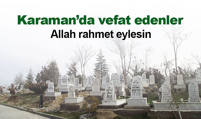 Aslen Karamanlı olup Başakşehir Mahallesinde ikamet etmekte olan Aysel Gökce (83) vefat etmiştir. Cenazesi 13 Ağustos Pazar günü öğle namazına müteakip musalladan kaldırılacak. Merhumun cenazesi, Karaman Şehir Mezarlığı 33 Nolu Ada'ya defnedilecek.Aslen Karamanlı olup Gevher Hatun Mahallesinde ikamet etmekte olan Geylani Çelik (60) vefat etmiştir. Cenazesi 13 Ağustos Pazar günü öğle namazına müteakip musalladan kaldırılacak. Merhumun cenazesi, Karaman Şehir Mezarlığı 105 Nolu Ada'ya defnedilecek.Aslen Çumralı olup Yenişehir Mahallesinde ikamet etmekte olan Hayriye Beydili (61) vefat etmiştir. Cenazesi 13 Ağustos Pazar günü öğle namazına müteakip musalladan kaldırılacak. Merhumun cenazesi, Karaman Şehir Mezarlığı 1 Nolu Ada'ya defnedilecek.Aslen Mersi'in Mut İlçesinden olup Siyaser Mahallesinde ikamet etmekte olan Süleyman Yıldırım (87) vefat etmiştir. Cenazesi 13 Ağustos Pazar günü öğle namazına müteakip Siyaser Camisinden kaldırılacak. Merhumun cenazesi, Karaman Siyaser Mezarlığı 1 Nolu Ada'ya defnedilecek.Karamanhaberleri.com olarak, vefat eden hemşehrilerimize Allah'tan rahmet, yakınlarına başsağlığı dileriz.