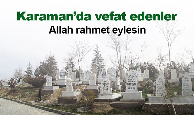 Aslen Çukurbağ Köyünden olup Çukurbağ'da ikamet etmekte olan Ali Özkan (85) vefat etmiştir. Cenazesi 16 Ocak Salı günü öğle namazına müteakip musalladan kaldırılacak. Merhumun cenazesi, Karaman Şehir Mezarlığı 1 Nolu Ada'ya defnedilecek.Aslen Göves Köyünden olup Kırbağı Mahallesinde ikamet etmekte olan Dilber Yorulmaz (79) vefat etmiştir. Cenazesi 16 Ocak Salı günü öğle namazına müteakip musalladan kaldırılacak. Merhumun cenazesi, Karaman Şehir Mezarlığı 20 Nolu Ada'ya defnedilecek.Aslen Uzunkuyu Köyünden olup Zembilli Ali Efendi Mahallesinde ikamet etmekte olan Halise Göktaş (65) vefat etmiştir. Cenazesi 16 Ocak Salı günü öğle namazına müteakip musalladan kaldırılacak. Merhumun cenazesi, Karaman Şehir Mezarlığı 1 Nolu Ada'ya defnedilecek.Aslen Afganistanlı olup Karaman'da ikamet etmekte olan Stare Ouzra (79) vefat etmiştir. Cenazesi 16 Ocak Salı günü öğle namazına müteakip musalladan kaldırılacak. Merhumun cenazesi, Karaman Şehir Mezarlığı 1 Nolu Ada'ya defnedilecek.Karamanhaberleri.com olarak, vefat eden hemşehrilerimize Allah'tan rahmet, yakınlarına başsağlığı dileriz.