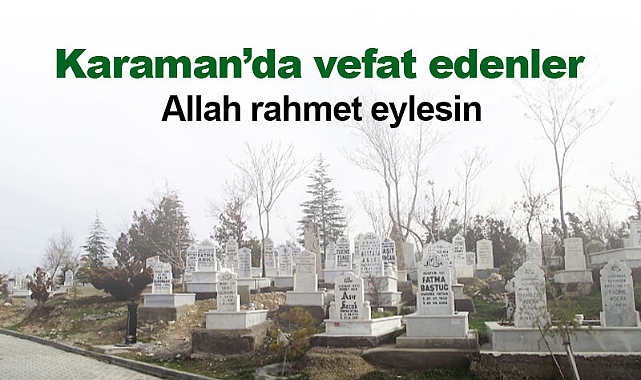 Aslen Zengenli olup Tabduk Emre Mahallesinde ikamet etmekte olan Durdu Tek (74) vefat etmiştir. Cenazesi 28 Eylül Perşembe günü öğle namazına müteakip Yeşil Cami'den kaldırılacak. Merhumun cenazesi, Karaman Şehir Mezarlığı 1 Nolu Ada'ya defnedilecek.Aslen Karamanlı olup Ankara'da ikamet etmekte olan Emine Yaşar (66) vefat etmiştir. Cenazesi 28 Eylül Perşembe günü öğle namazına müteakip musalladan kaldırılacak. Merhumun cenazesi, Karaman Şehir Mezarlığı 30 Nolu Ada'ya defnedilecek.Aslen Kazımkarabekirli olup Valide Sultan Mahallesinde ikamet etmekte olan Muhsin Kesek (87) vefat etmiştir. Cenazesi 28 Eylül Perşembe günü ikindi namazına müteakip musalladan kaldırılacak. Merhumun cenazesi, Karaman Şehir Mezarlığı 1 Nolu Ada'ya defnedilecek.Karamanhaberleri.com olarak, vefat eden hemşehrilerimize Allah'tan rahmet, yakınlarına başsağlığı dileriz.