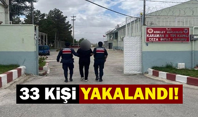 (16.888) şahıs ve (4.445) araç sorgulanmışJANDARMA DEDEKTİFLERİ (JASATLAR) başta olmak üzere asayiş ekiplerince yapılan çalışmalar neticesinde; Uyuşturucu Madde Ticareti Yapma, Mühür Bozma, Kadına Karşı Basit Yaralama ve Çocuğa Eziyet, Kullanmak İçin Uyuşturucu veya Uyarıcı Madde Almak, Kabul Etmek, Bulundurmak ve Kullanmak, Hakaret, Kasten Yaralama, Bina İçinde Muhafaza Altına Alınmış Eşya Hakkında Hırsızlık, Dolandırıcılık, Basit Yaralama, Bıçak veya Diğer Aletler İzinsiz Olarak Satma Satın Alma Taşıma veya Bulundurmak suçlarından aranan (33) şahıs yakalanmış olup;