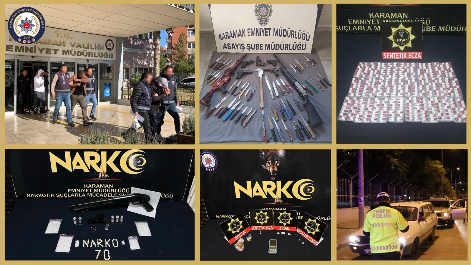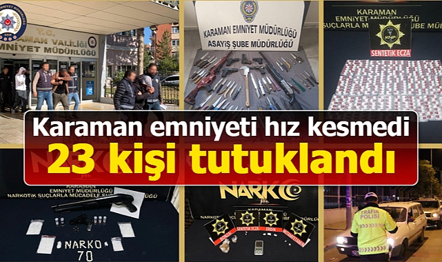 Karaman Emniyet Müdürlüğü'nün kent merkezindeki genel asayiş çalışmaları devam ediyor. Karaman'da asayiş, narkotik ve trafik olayları başta olmak üzere vatandaşların huzurunu bozacak her türlü suçun engellenmesi, suça karışan şahısların yakalanması amacıyla 25 Kasım – 01 Aralık 2023 tarihleri arasında yapılan çalışmalarda;• (7231) şahıs sorgulanmış,