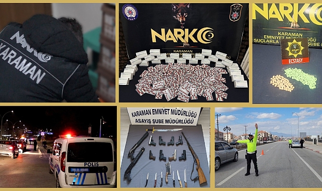 • (20) sürücü belgesine el konulmuştur. Denetimler esnasında, (8) adet ruhsatsız tabanca, (3) adet tüfek, (8) adet kesici/delici alet, (16) gram uyuşturucu madde, (1857) adet uyuşturucu hap, (1) adet hassas terazi ele geçirildi.Karaman'daki huzur ve güven ortamının devamını sağlamaya yönelik denetim ve uygulamalara kararlı ve kesintisiz bir şekilde devam edileceği bildirildi.
