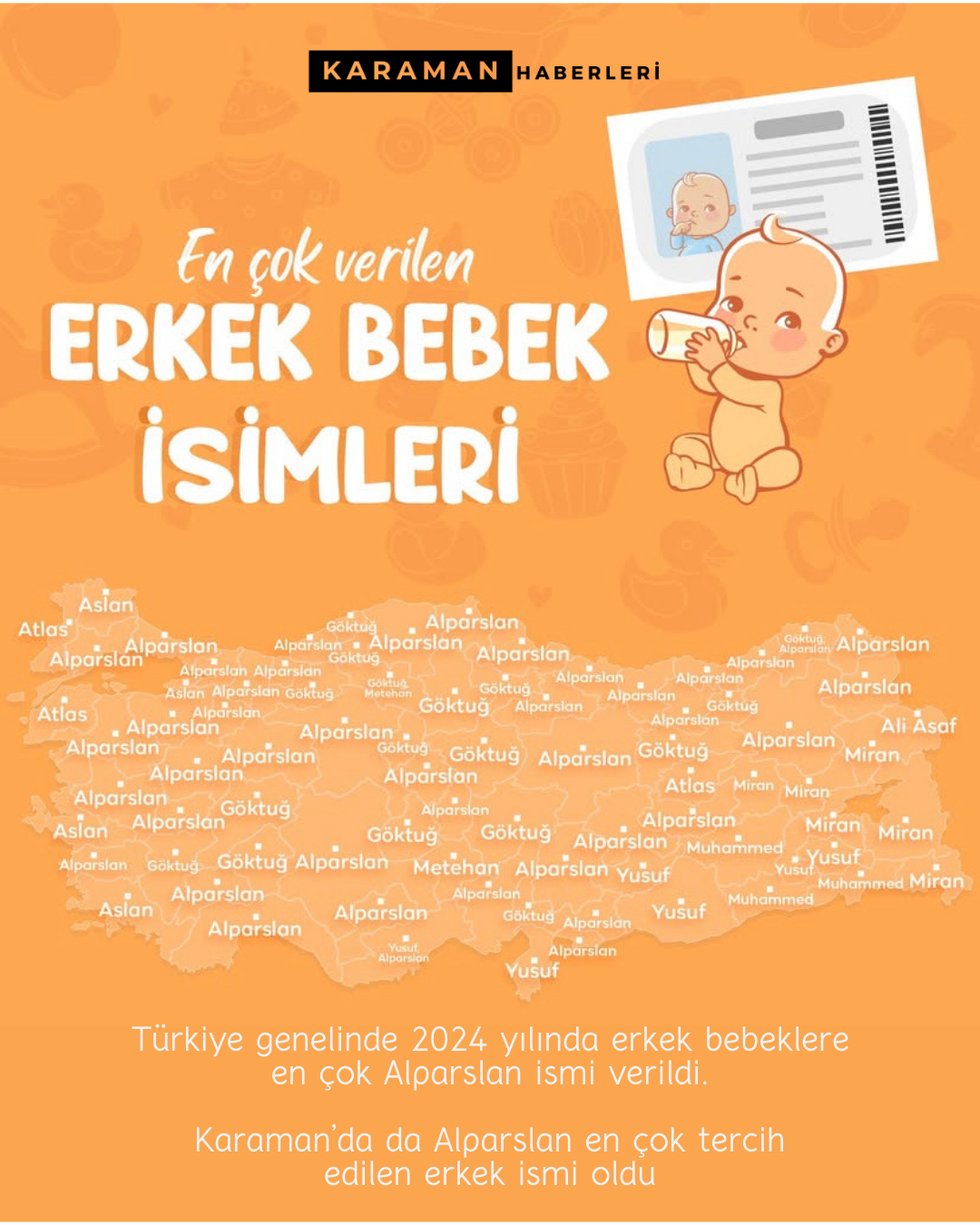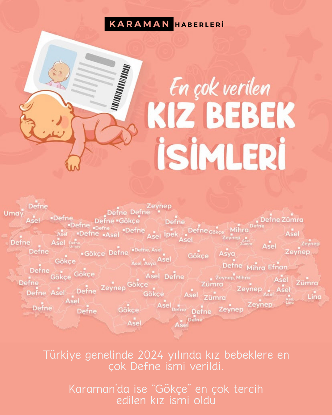 Türkiye'de 2024 yılında 937 bin 369 bebek nüfus kütüklerine tescil edildi. Türkiye geneli çok tercih edilen bebek isimlerinin ise Defne ve Alparslan olduğunu bildirildi. Karaman'da ise en çok tercih edilen erkek bebek ismi yine Alparslan olurken, kız bebek ismi Gökçe oldu.