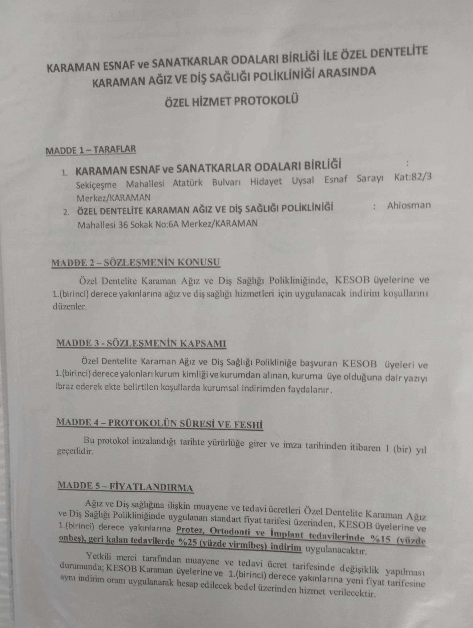 Karaman'da diş rahatsızlığı bulunan esnaflara müjde geldi. Karaman Esnaf ve Sanatkarlar Odası Birliği diş rahatsızlığı bulunan üyelerine özel indirim uygulanacağını açıkladı.Özel Dentelite Diş Polikliniğinde uygulanacak olan tedavilerde yüzde 25'e varan indirimler uygulanacak.Karaman Esnaf Odaları Birliği tarafından yapılan açıklamada şu ifadeler yer aldı;"Karaman Esnaf Odaları Birliği üyelerine; protez, ortodonti ve implant tedavilerinde %15 geri kalan tedavilerde ise %25 indirim uygulanacaktır. Ayrıntılı bilgiler ekteki görselde mevcuttur."